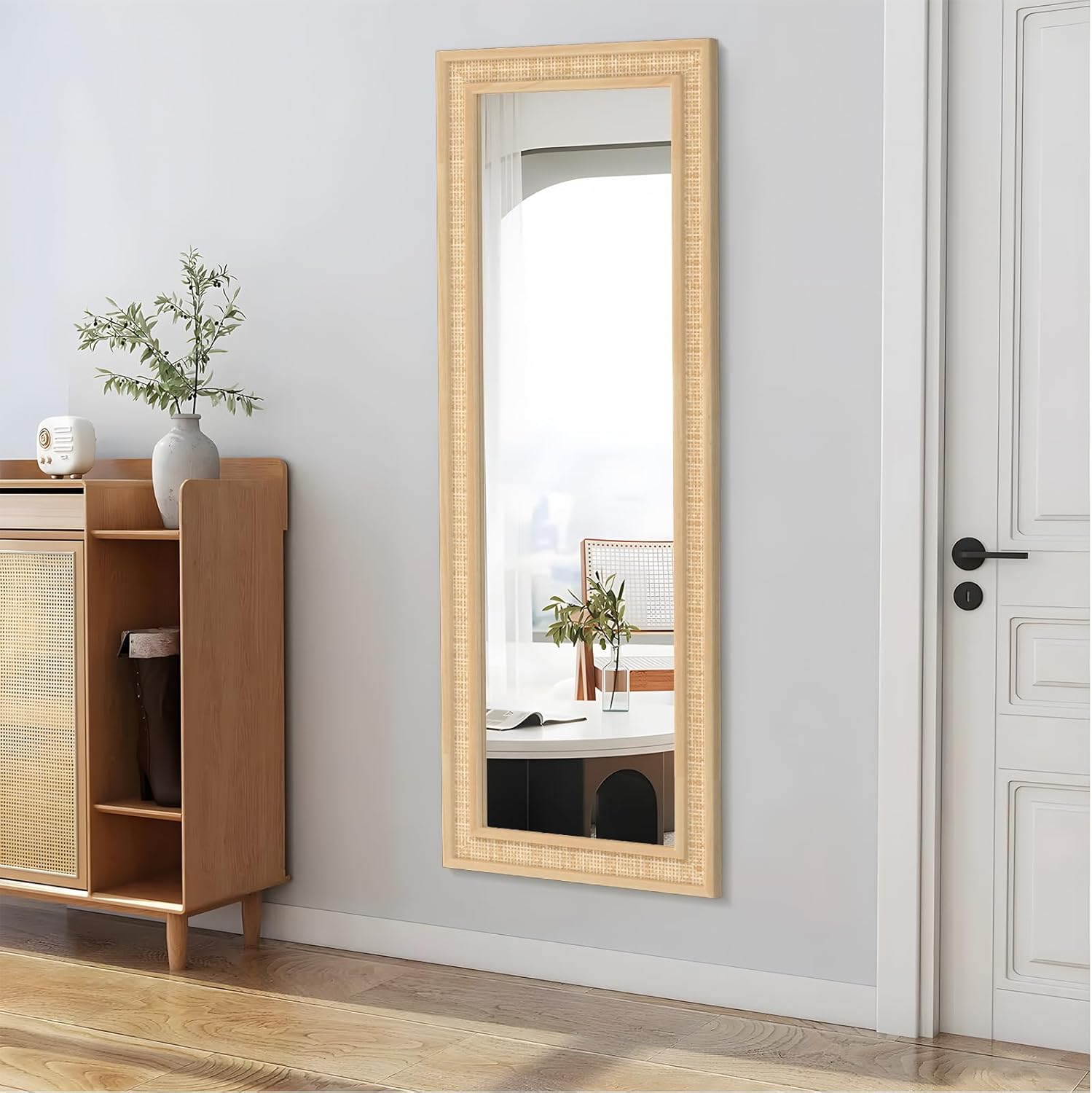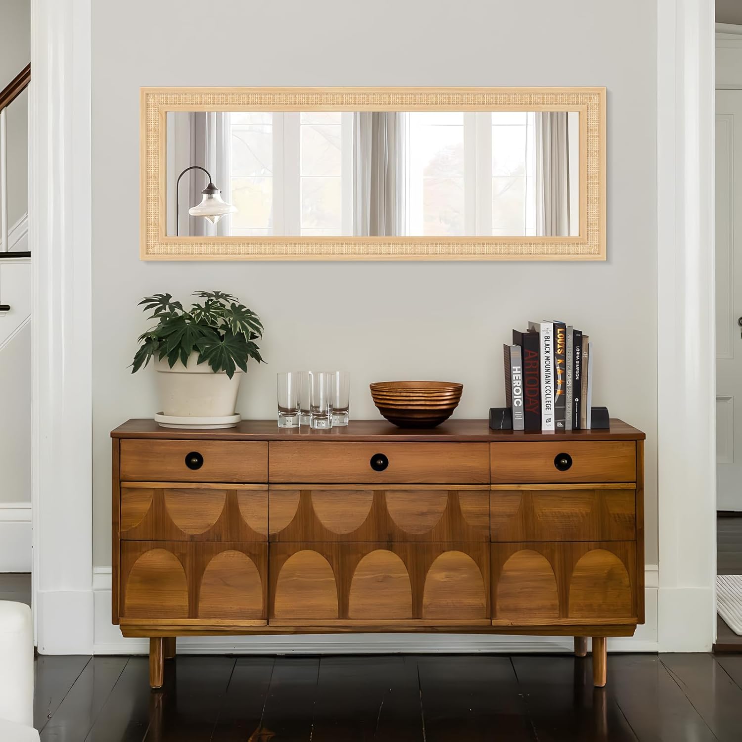 - 【Natural Rattan and Solid Wood Frame】This white rectangle mirror use natural rattan and solid wood edge, measures 18" x 48" with a 3.5" frame, 1.1" mirror depth.