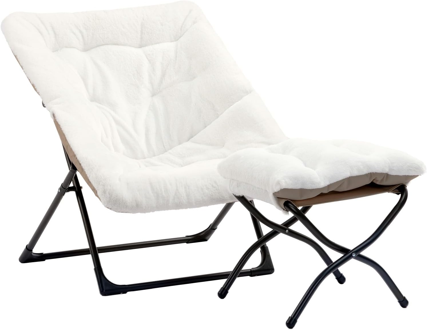 HollyHOME X-Large Saucer Chair with Foldable Ottoman, Comfy Oversized Folding Chair and Folding Footrest Stool Set, Faux-Fur Reading Chair and Footstool for Living Room, Bedroom, White Chair&Stool
