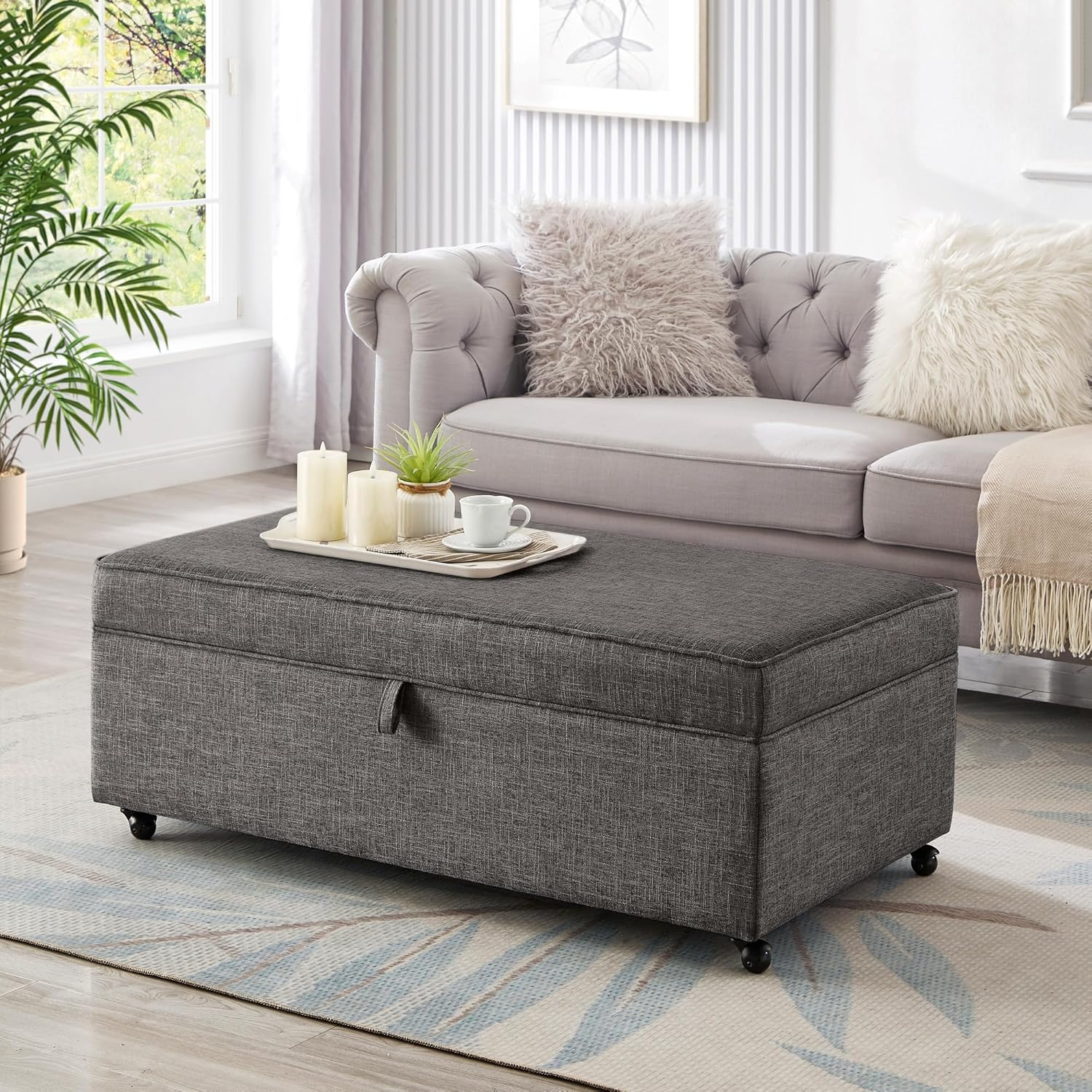 45" Modern Sofa Ottoman with Storage,Linen Upholstered Storage Bench with Rotation Casters and Safety Hinge, for Living Room,Charcoal Grey