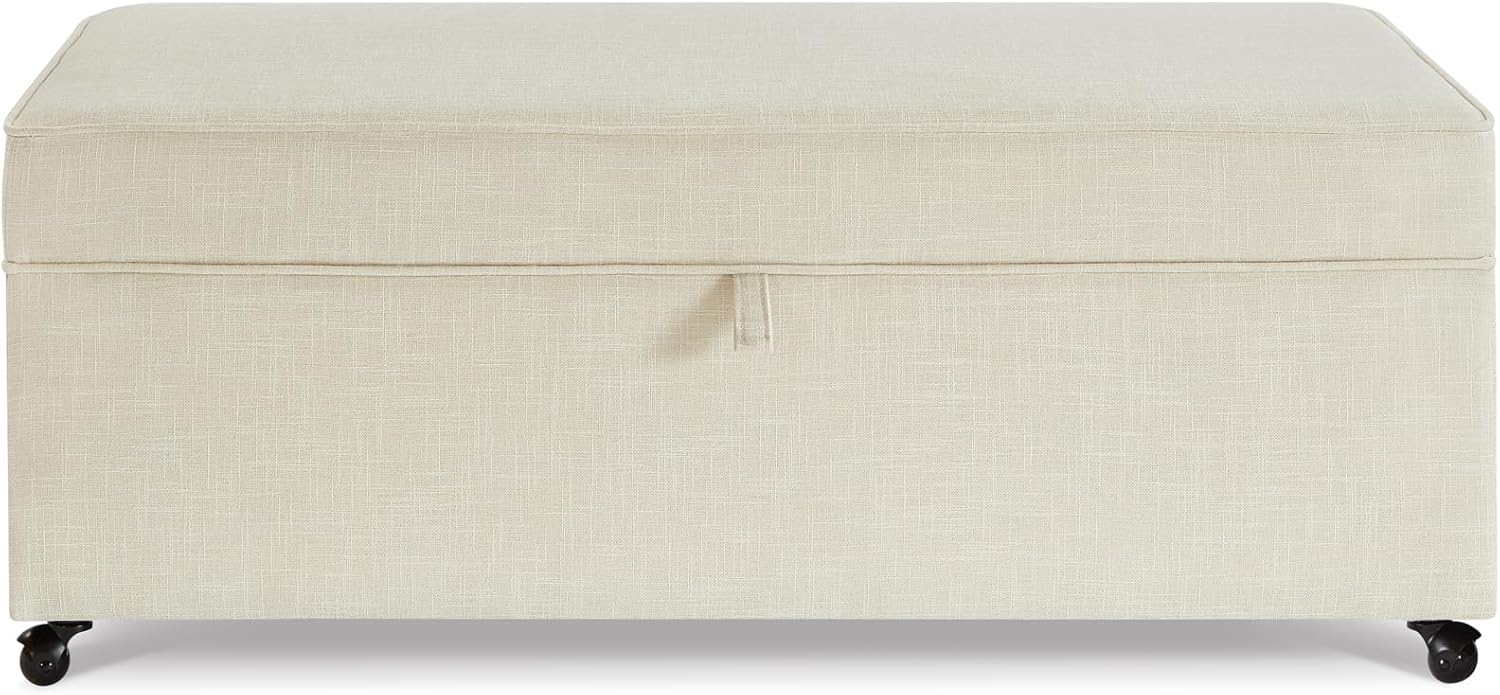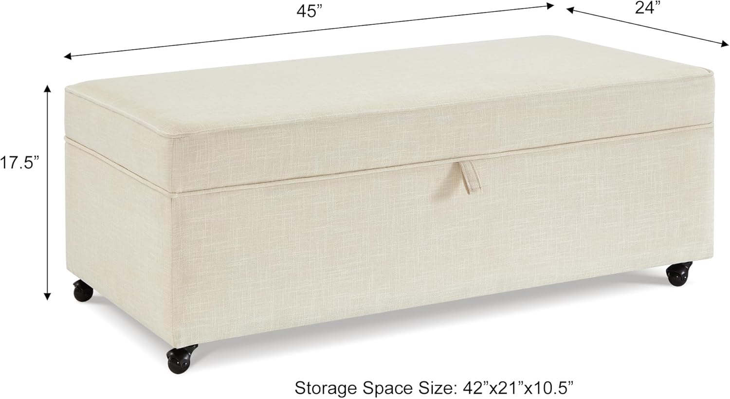 45" Modern Sofa Ottoman with Storage,Linen Upholstered Storage Bench with Rotation Casters and Safety Hinge, for Living Room,Ivory