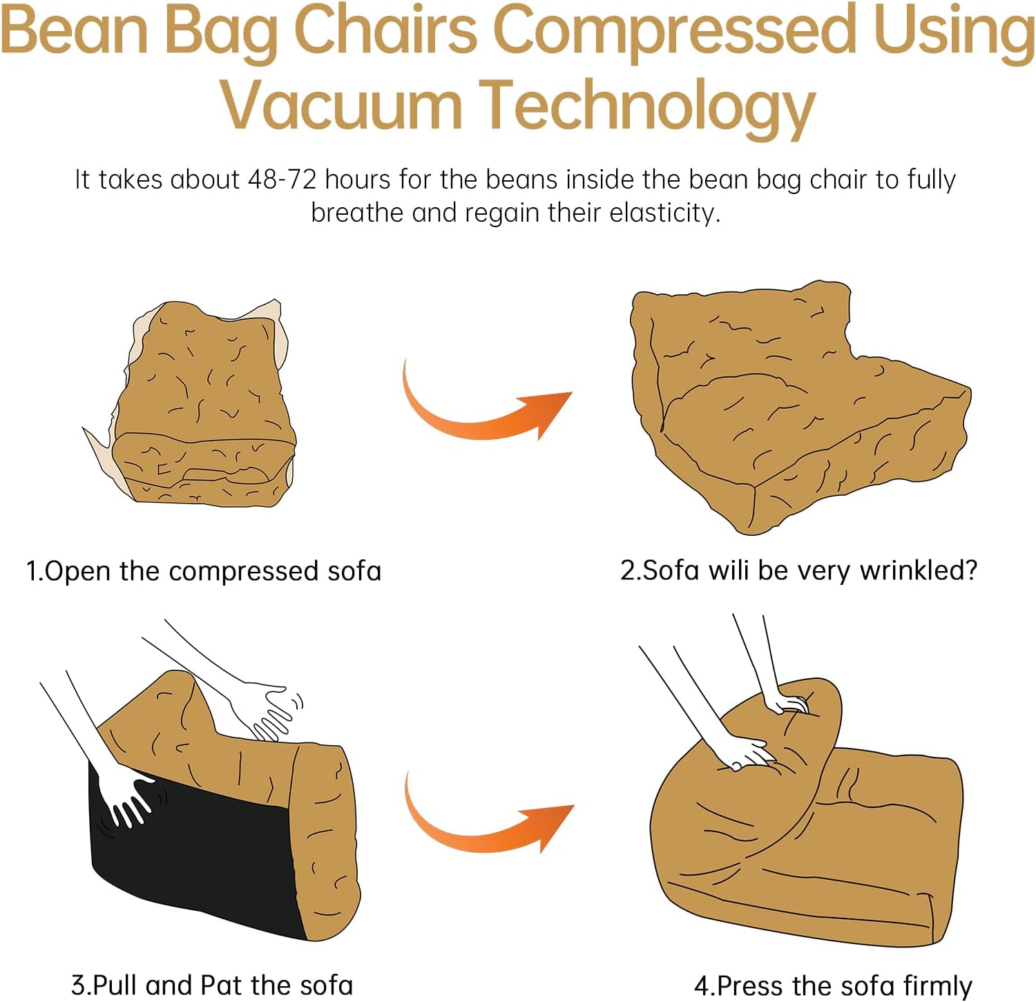 - No Assembly Required: This bean bag chair with ottoman has been filled. It is shipped compressed and will expand right after you open the package. Simply cut the package open and need to leave it for about 48-72 hours to allow the beans inside the beanbag chair to breathe freely and recover elasticity. Enjoy the amazing bean bag sofa,saving you time and effort, enjoying it at once.