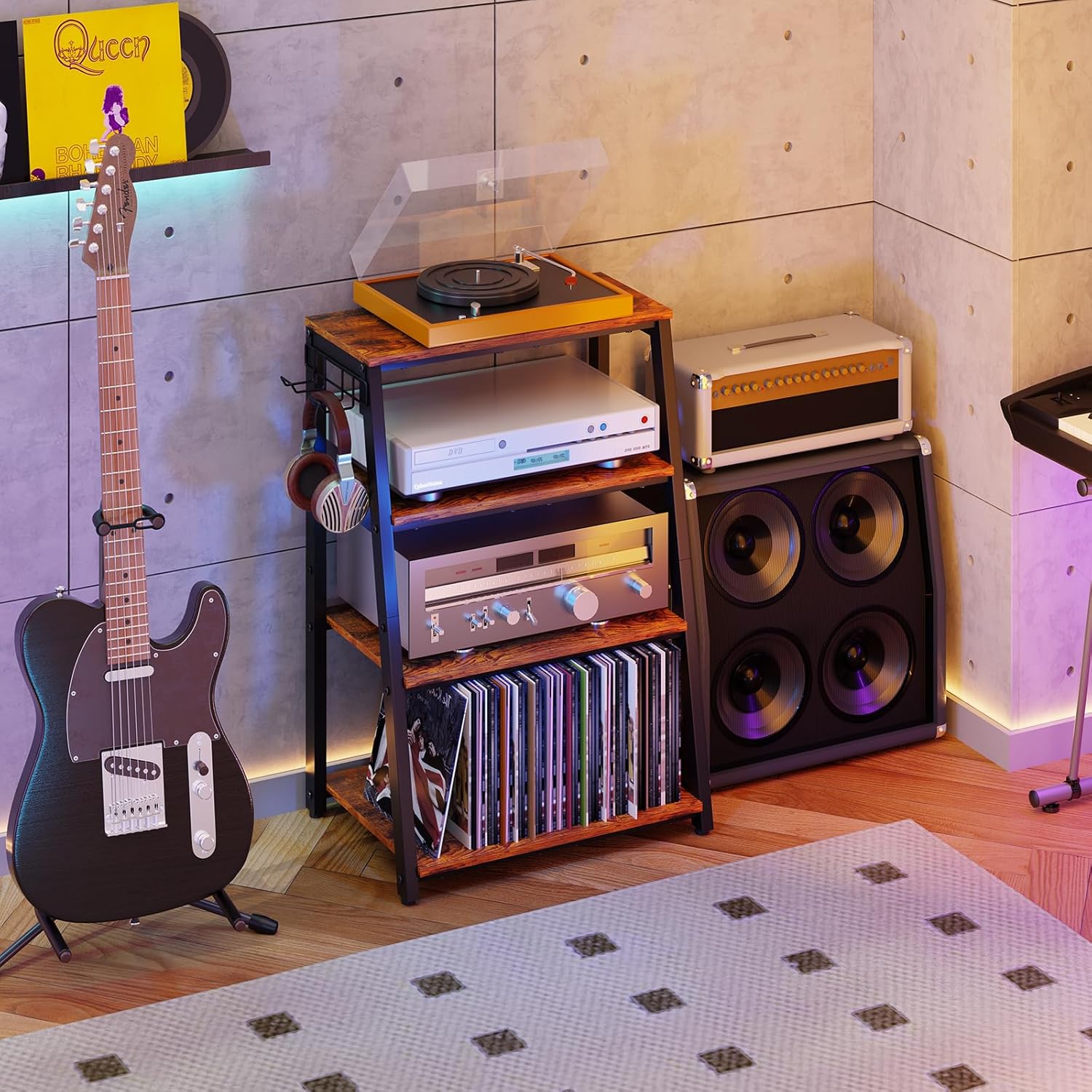 4-Tier AV Media Stand with 2 Hooks,Heavy Duty Stereo Cabinet Furniture-Large Stereo Rack and Game Console Stand,Wooden Record Player Stand,Audio Stand Perfect for DVD Players/Game Console/TV Box/Xbox