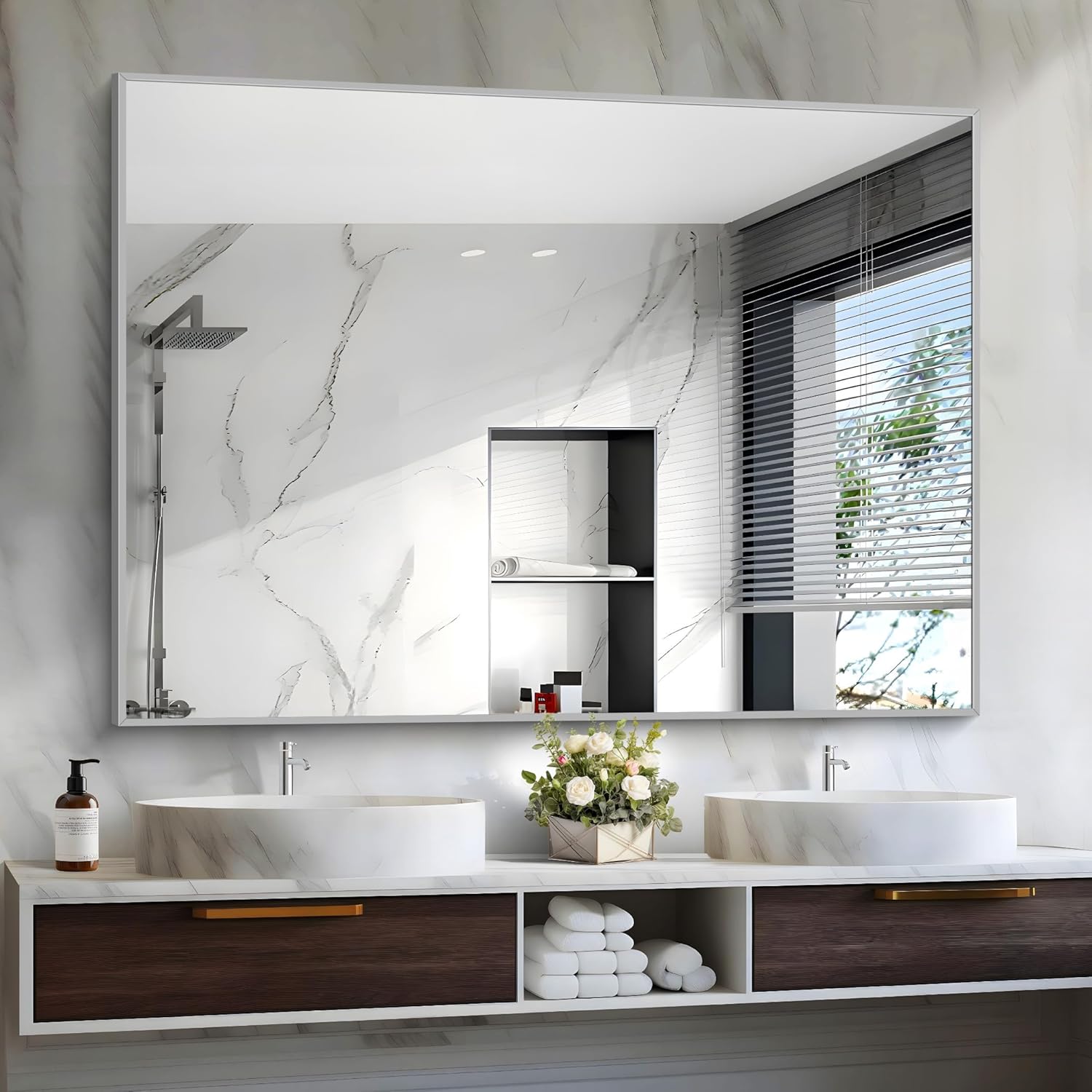 - PREMIUM FRAME: Rectangle mirror with Aluminum alloy frame, has waterproof, anti-rust and anti-crack functions, which can meet your sturdy use needs; the brush design of the frame brings you a comfortable touch.