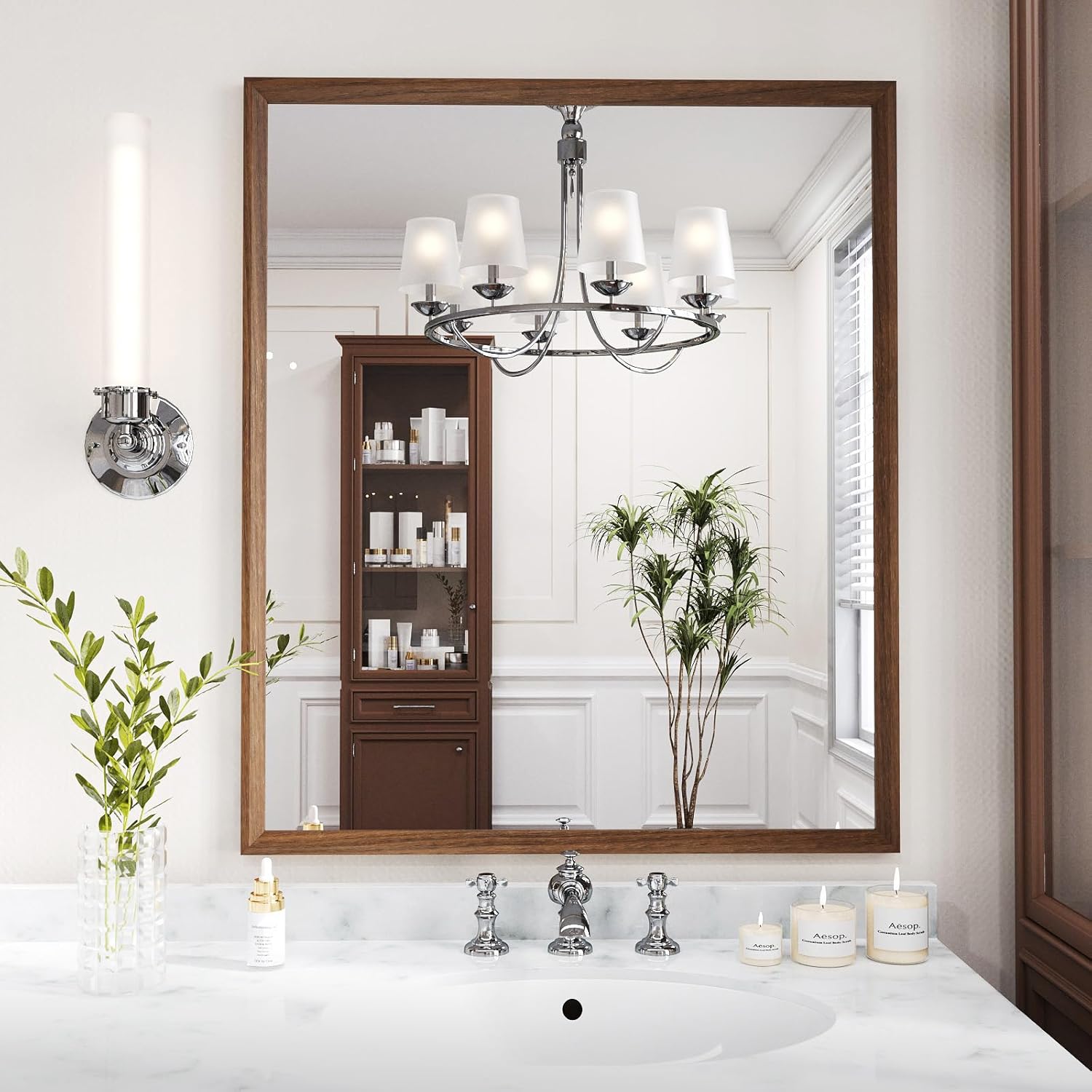 WEER Walnut Framed Mirror for Bathroom, 36x30 Inch Wall Mounted Mirror, Wood Grain Framed Vanity Mirror, Farmhouse Bathroom Mirror, Tempered Glass, Vertically or Horizontally, Anti-Rust