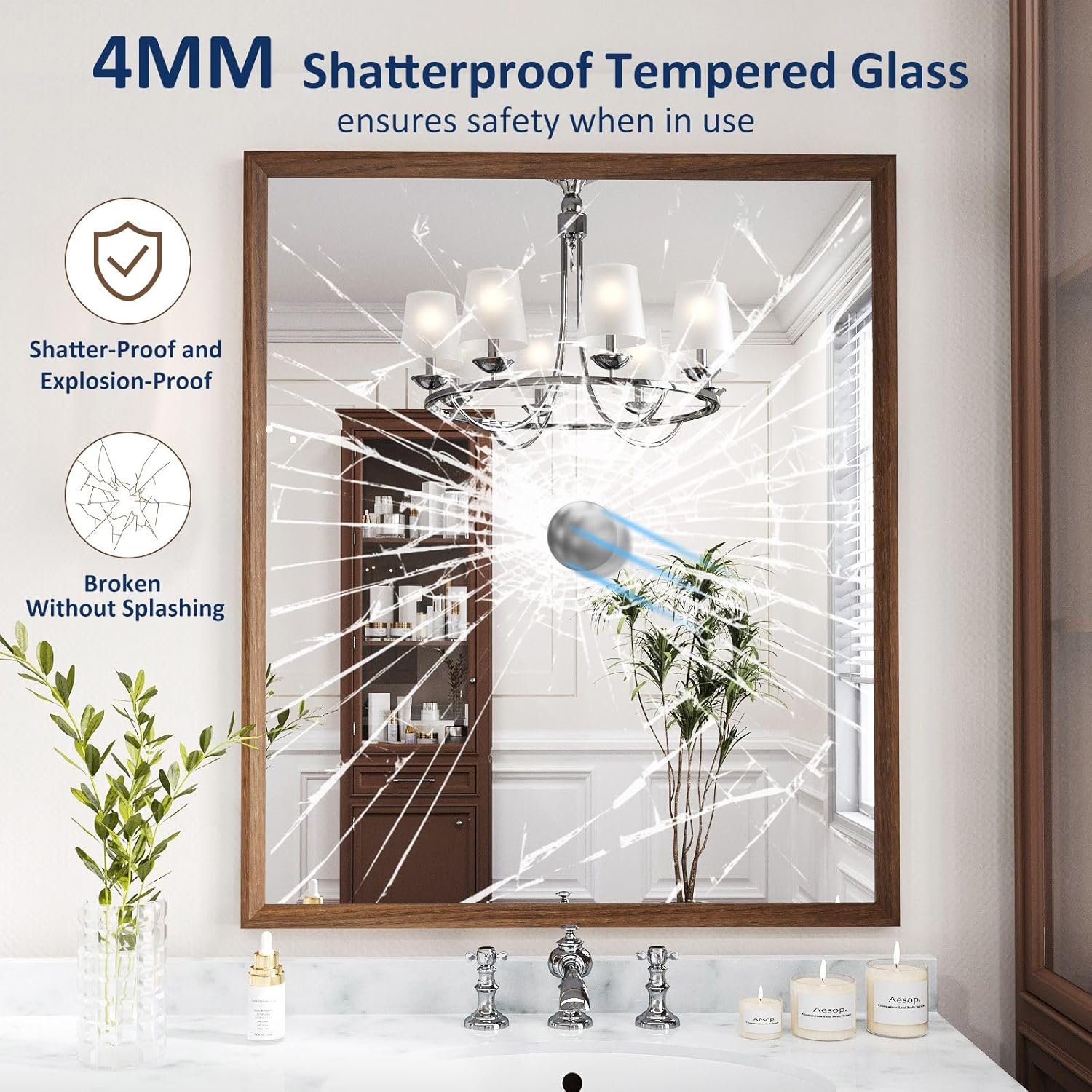 - 【Shatterproof Material】Our walnut wood grain framed mirror is made of 4MM tempered glass, shatterproof, explosion-proof, much sturdy and durable. The mirror is also affixed with shatterproof film, which makes it fixes the broken glass, and much safer to use and easy to clean;