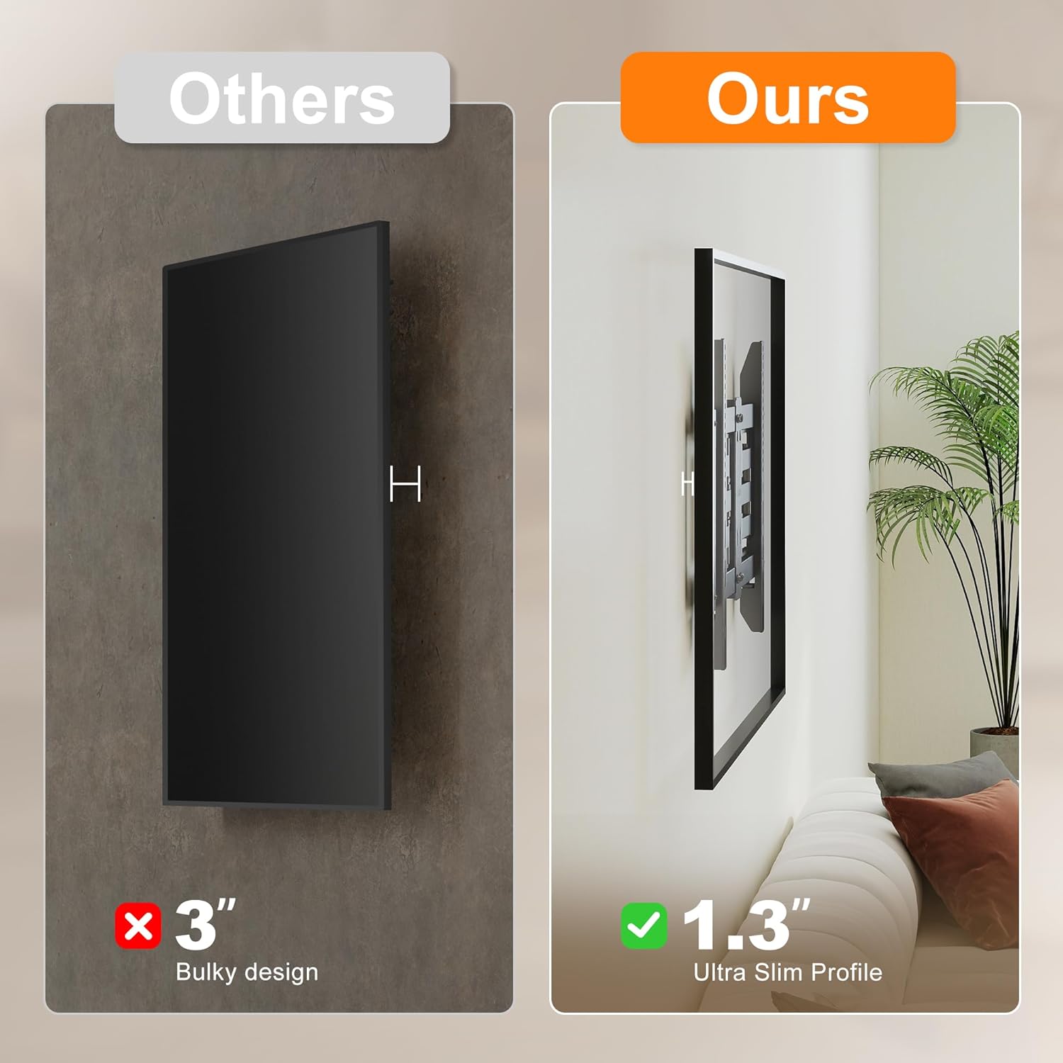 - SPACE SAVING: Super slim TV wall mount can retract to only 1.3'', which greatly narrow the gap between TV and the wall and save space. Besides, it can extend up to 11.8''.