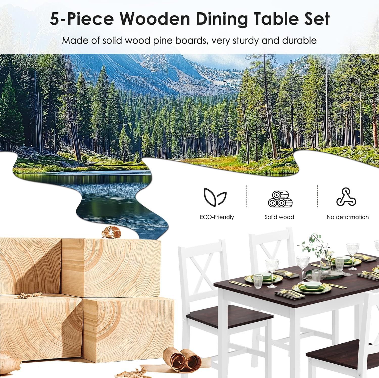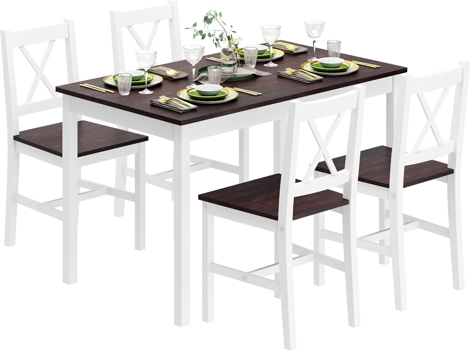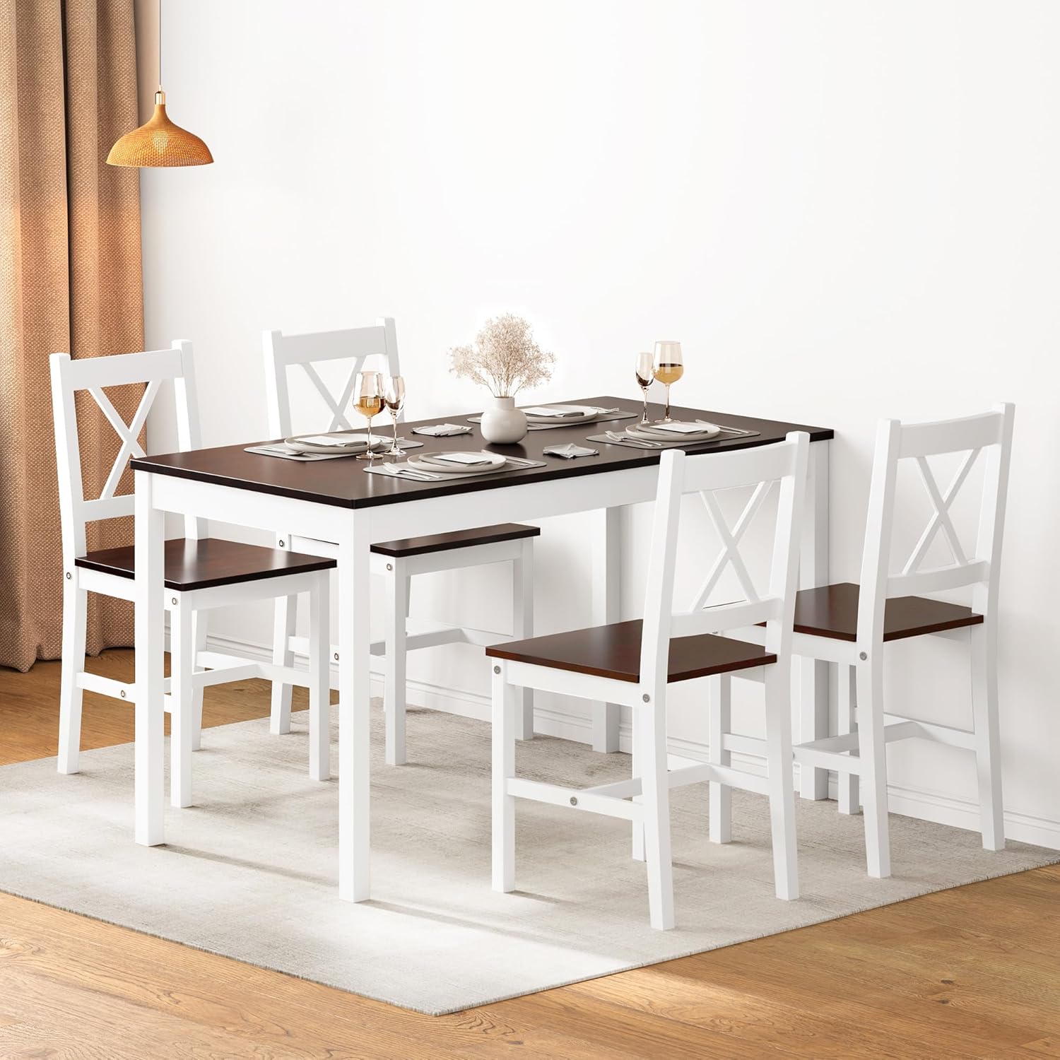 soges Kitchen Dining Table Chairs Set for 4, 42.5 inch Pine Wood Dining Room Table with 4 Chairs, 5-Piece Kitchen Table Chairs Set for Small Space, Apartment, Dinette, Breakfast, Walnut & White