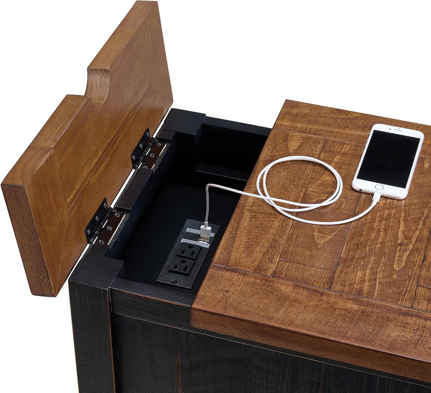 - HIDDEN POWER FOR EASY DEVICE CHARGING – Stay powered up and connected with a discreet flip-top compartment that reveals two three-prong outlets and two USB ports. Keep all your devices charged while maintaining a sleek, tidy space.