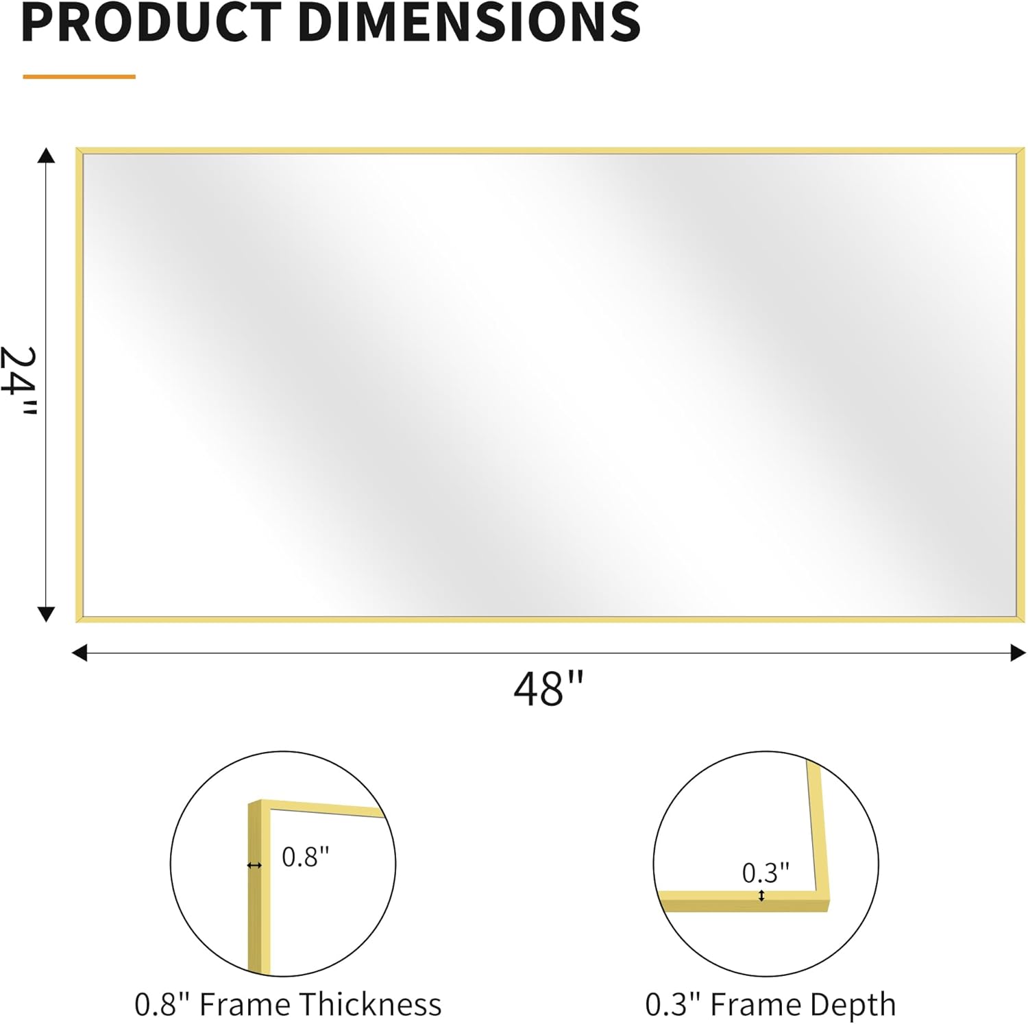 - Modern Design:KOCUUY 24"x48" gold vanity mirror is with innovative design which gives the wall mirror a more fashion feel. With a classic square corner, the wall mounted mirror allows for creativity and functionality in bathroom, bedroom, entryway and anywhere else. Let your living space be an expression of your personal style, not limited to modern or contemporary, farmhouse or industrial