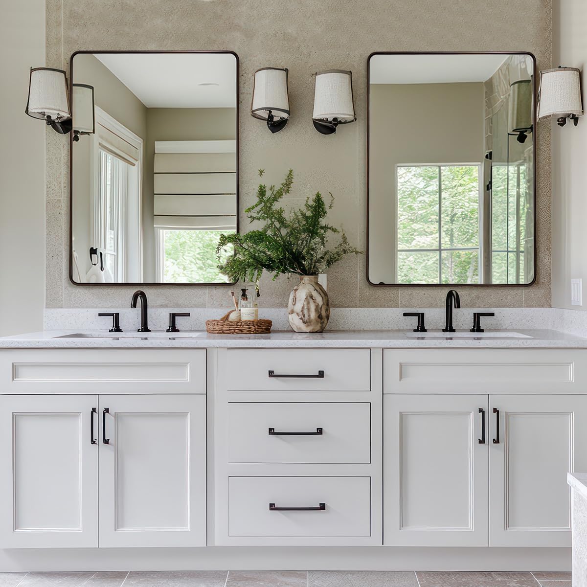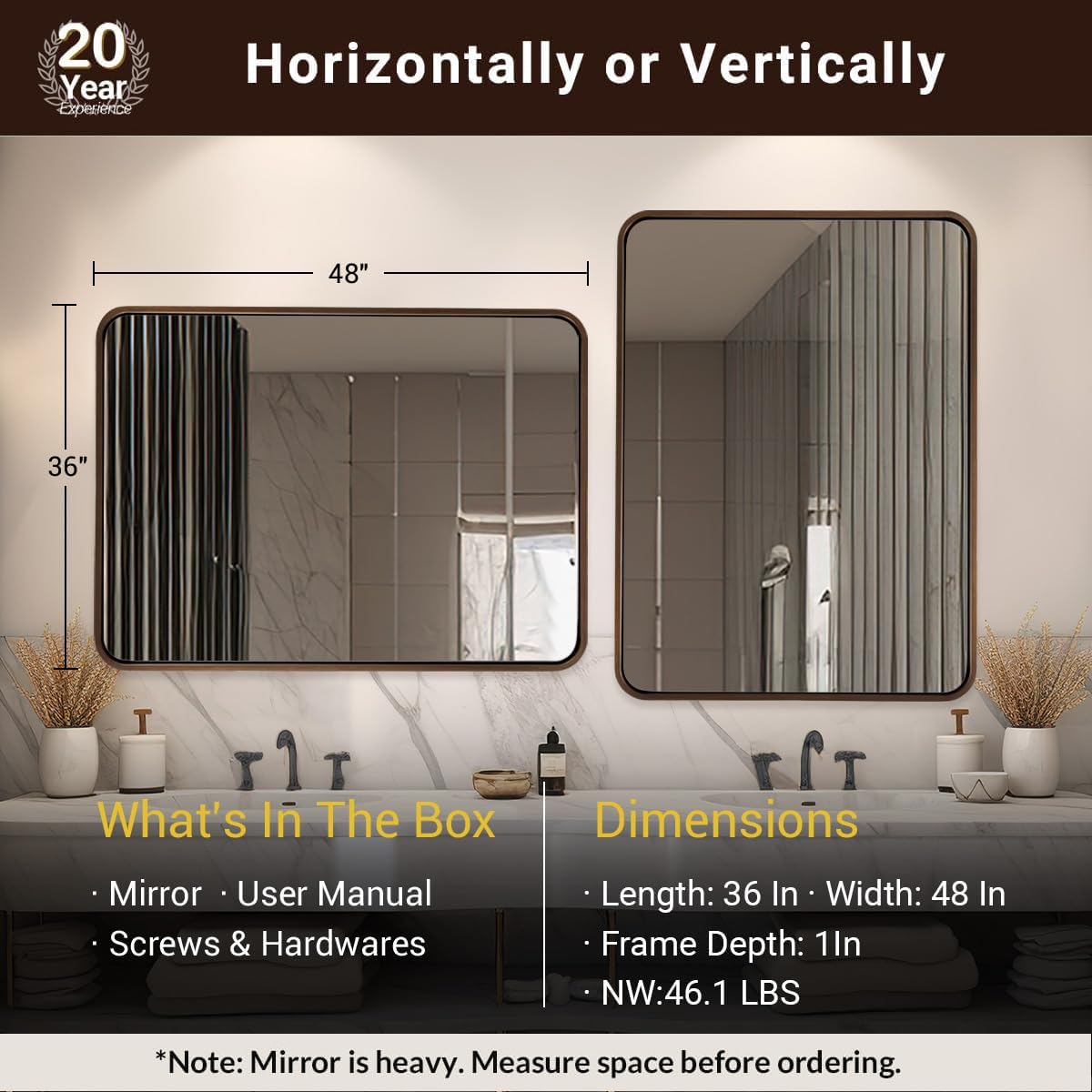 - Premium Quality: Our rustproof metal frame and shatterproof 4mm HD glass supported by a 9mm MDF backboard make for a safe and timeless bronze vanity mirror that weighs in at 46.10lbs