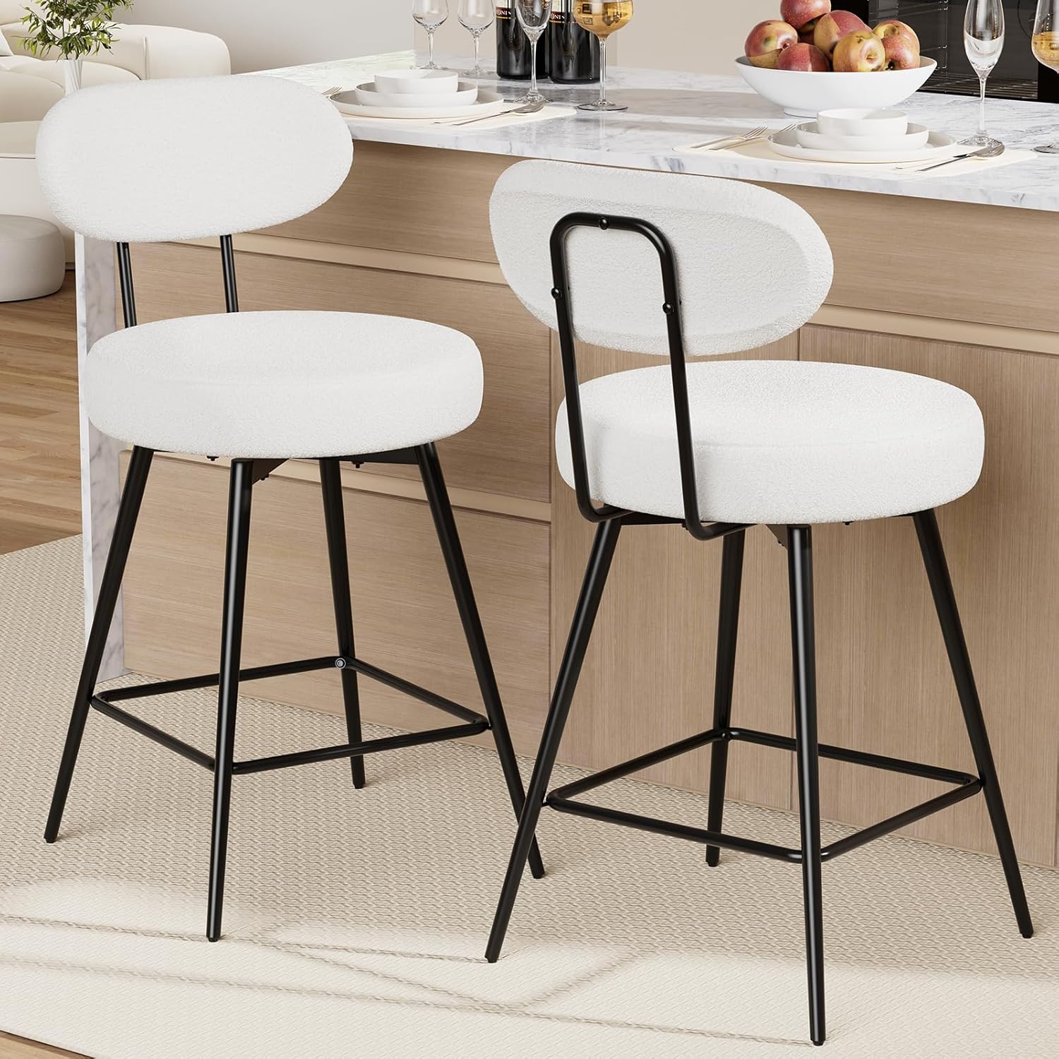 HOMMPA Counter Height Swivel Bar Stools Set of 2 Boucle Barstools 26'' Upholstered Modern Counter Barstools with Back Metal Legs Bar Stools Chairs for Kitchen Counter Island White
