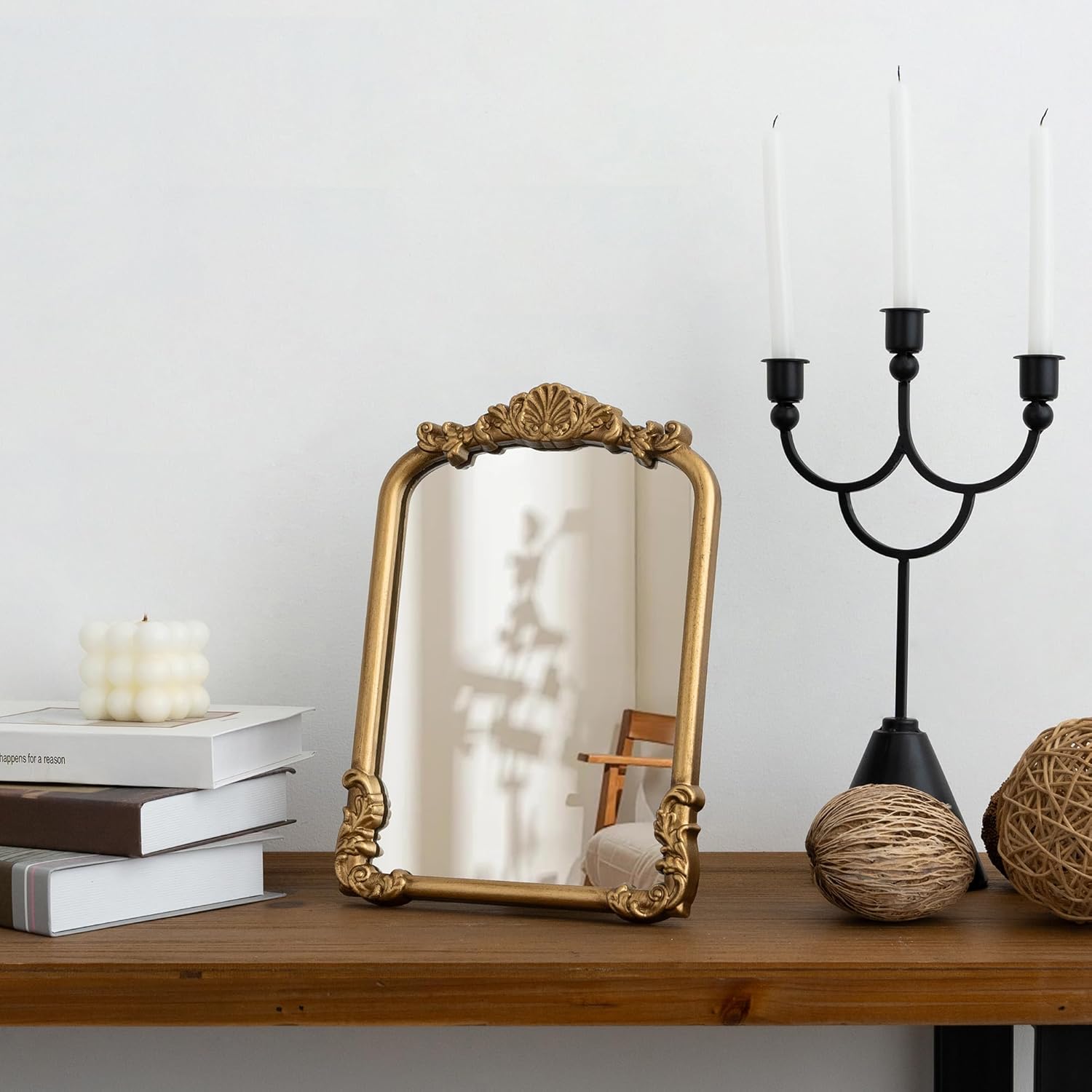 Vintage Vanity Mirror Small Gold Makeup Desk Mirror with Stand Antique Traditional Arched Table Mirror 8.5x12 for Countertop Tabletop Living Room Bedroom Bathroom