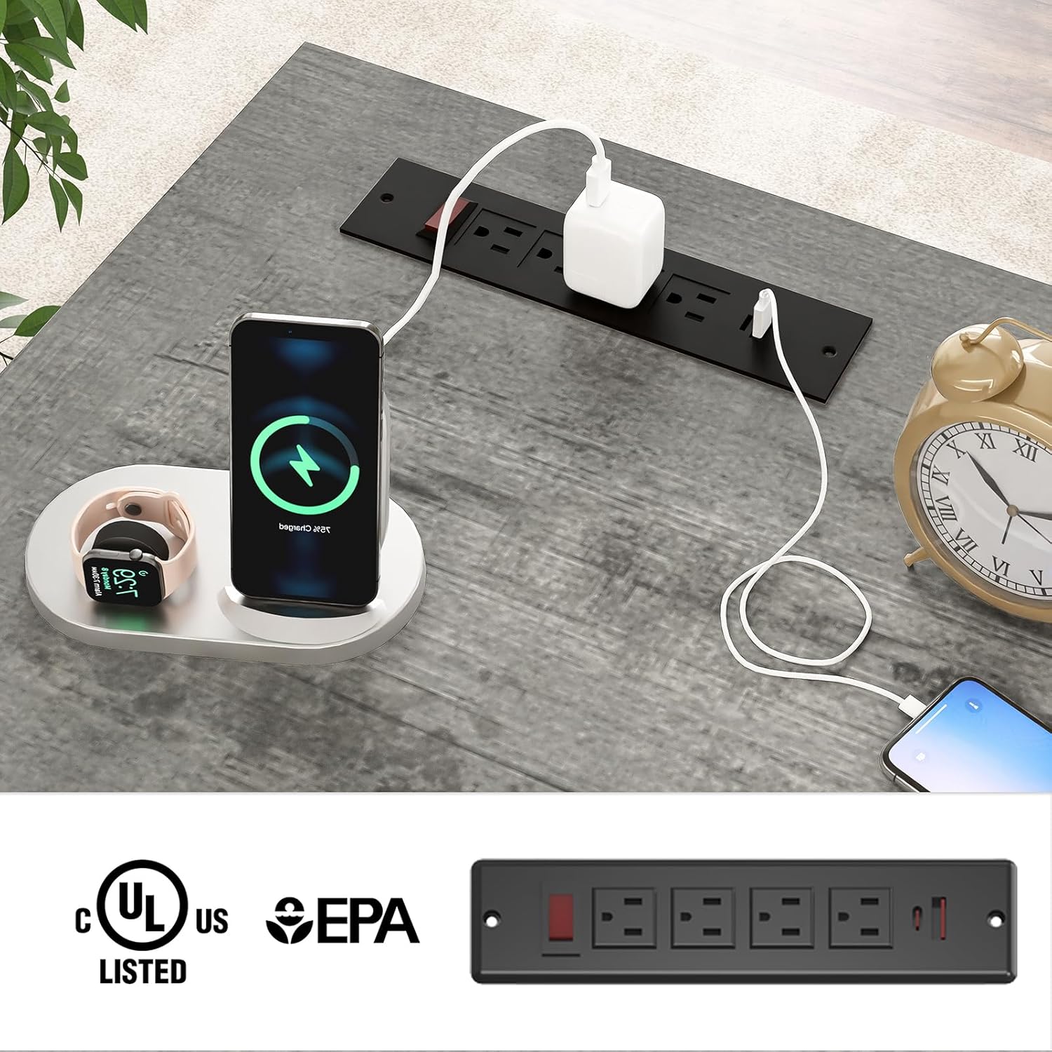 - 【Built-in Charging Station】Stay connected and organized with a built-in charging hub that includes 4 power outlets and 2 USB ports. This station allows you to charge up to 6 devices simultaneously, with an easy-access switch for safe, one-button power control. Compatible with phones, tablets, and laptops, it’s perfect for keeping your devices powered up while you work.