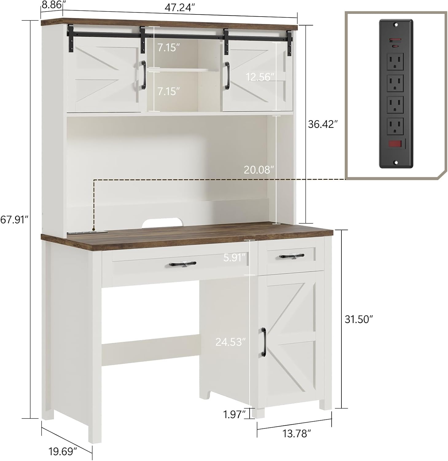Farmhouse 47" Executive Desk, Computer Desk with 2 Drawers and Storage Cabinet, Home Office Desk with Hutch, Charging Hub, Workspace for Work and Study, Antique White