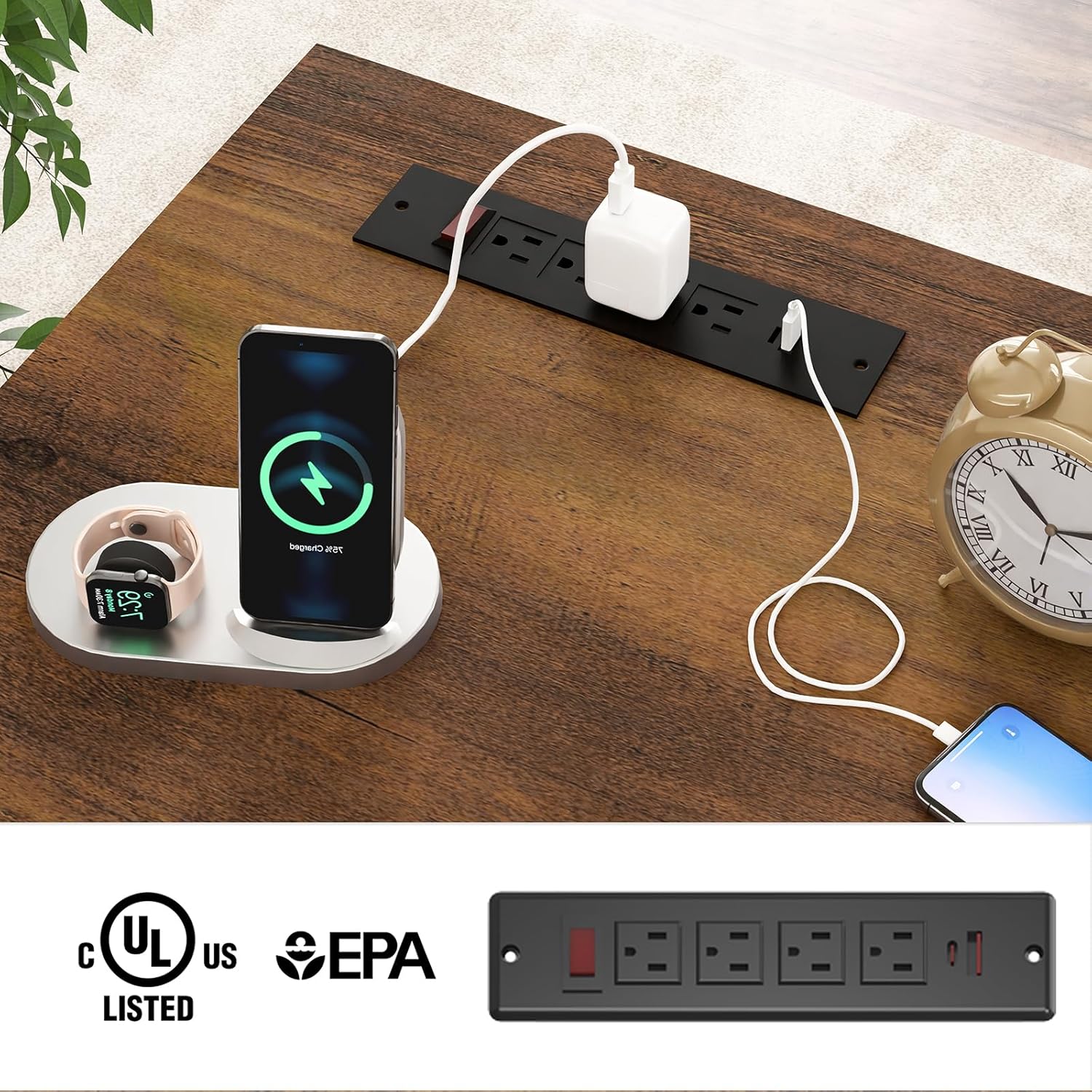 - 【Built-in Charging Station】Stay connected and organized with a built-in charging hub that includes 4 power outlets and 2 USB ports. This station allows you to charge up to 6 devices simultaneously, with an easy-access switch for safe, one-button power control. Compatible with phones, tablets, and laptops, it’s perfect for keeping your devices powered up while you work.