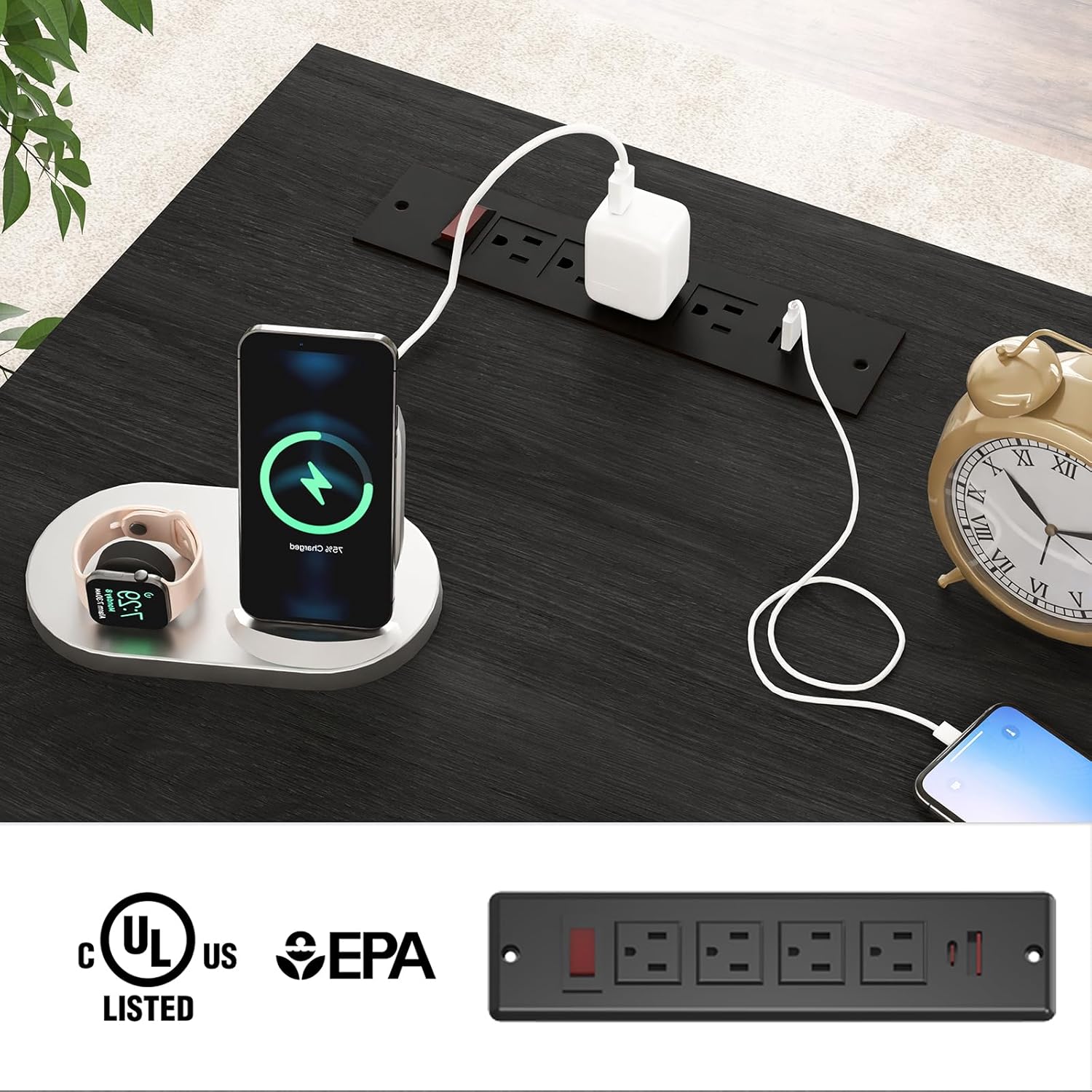 - 【Built-in Charging Station】Stay connected and organized with a built-in charging hub that includes 4 power outlets and 2 USB ports. This station allows you to charge up to 6 devices simultaneously, with an easy-access switch for safe, one-button power control. Compatible with phones, tablets, and laptops, it’s perfect for keeping your devices powered up while you work.