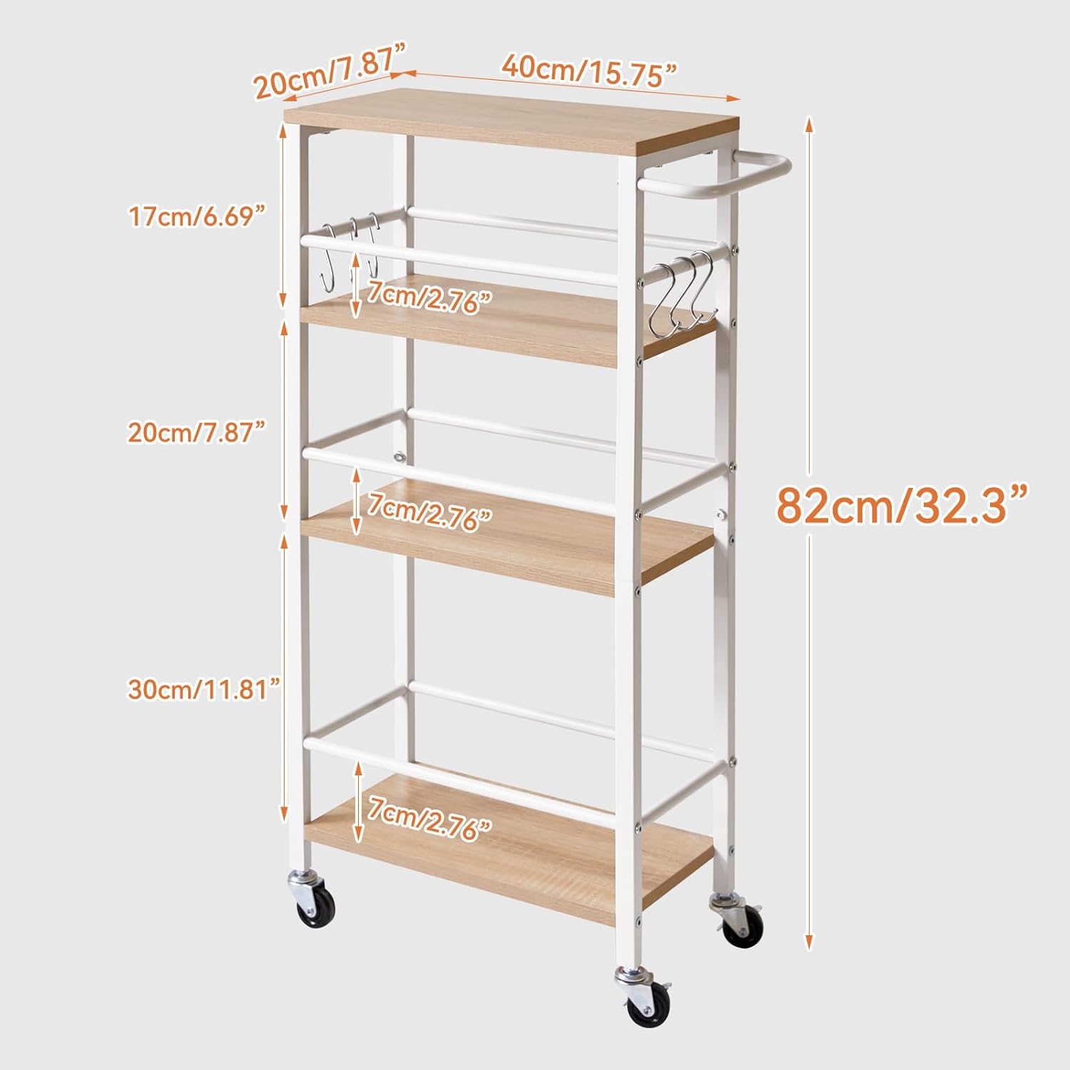 IBUYKE 7.8" Slim Rolling Cart,4 Tier Metal Kitchen Laundry Storage Cart,Industrial Narrow Utility cart,Trolley with Handle and Wooden Tabletop,for Kitchen, Living Room,Bathroom,Natural UTMJ065R