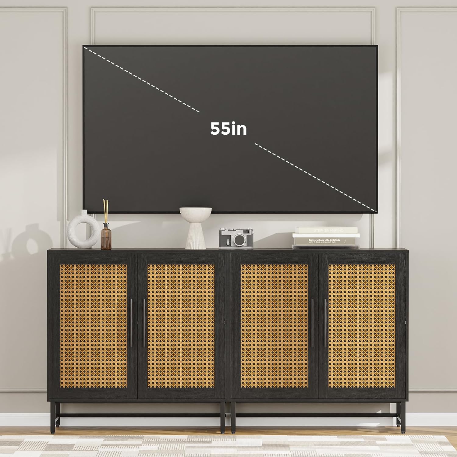 - Multi-Functional Wood Cabinet: This accent cabinet set can be served as large TV console, entryway cabinet, or bar cabinet, which is also perfect for organizing your living room, dining room, or kitchen essentials.Waterproof paint on the cabinet surface with natural rattan decorated door can effectively prevent moisture.