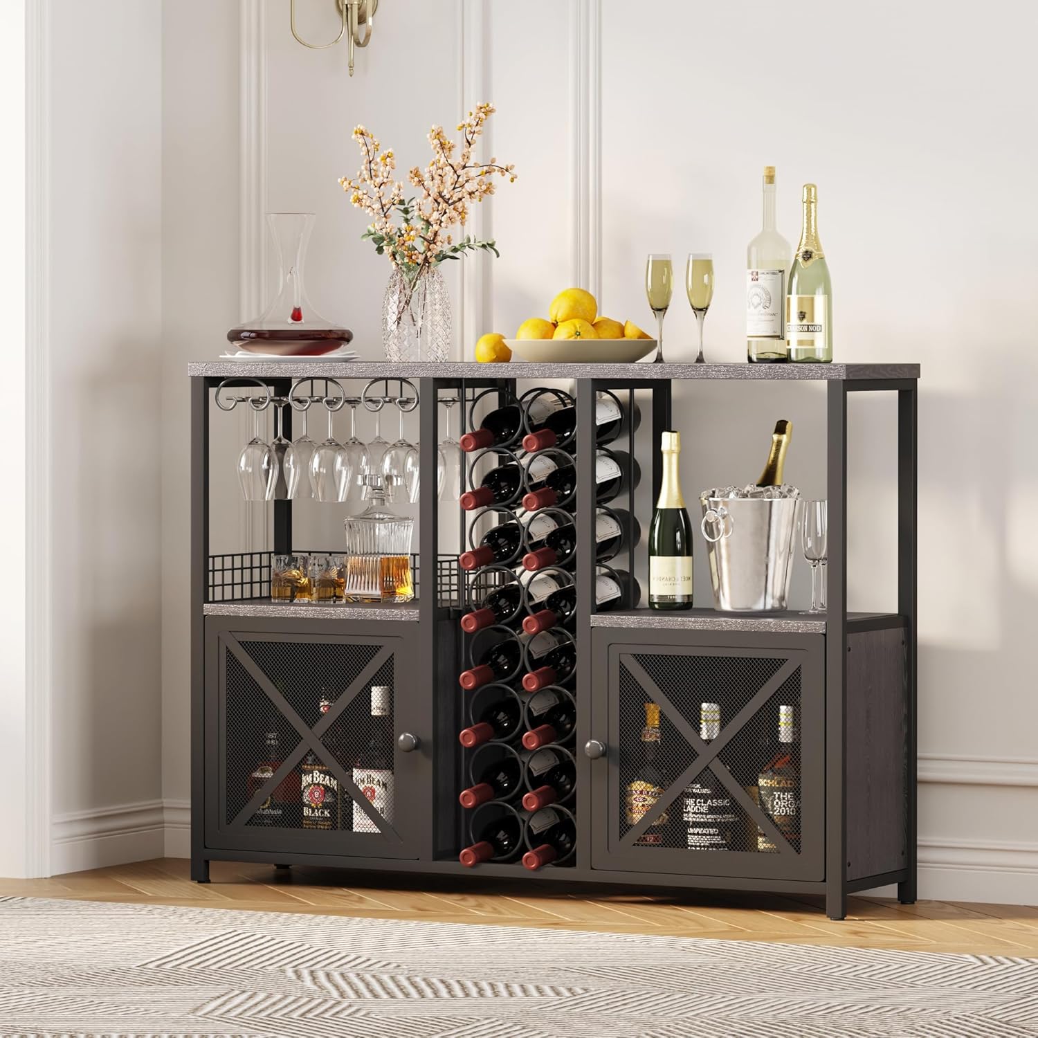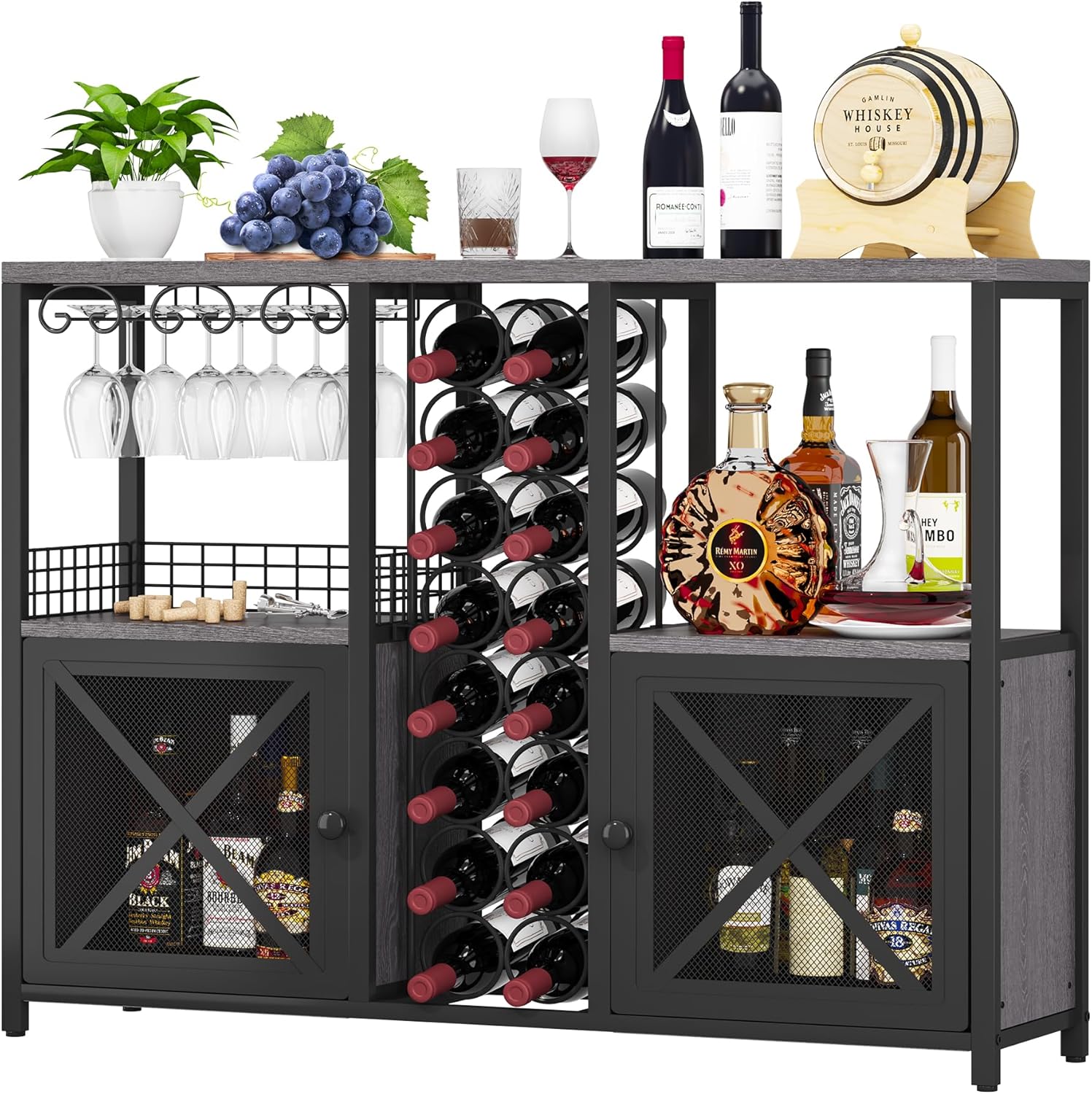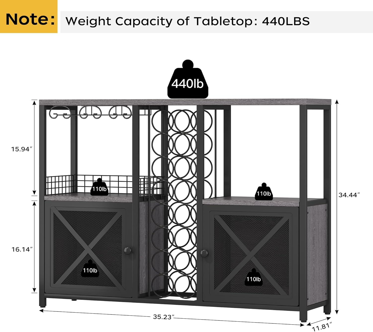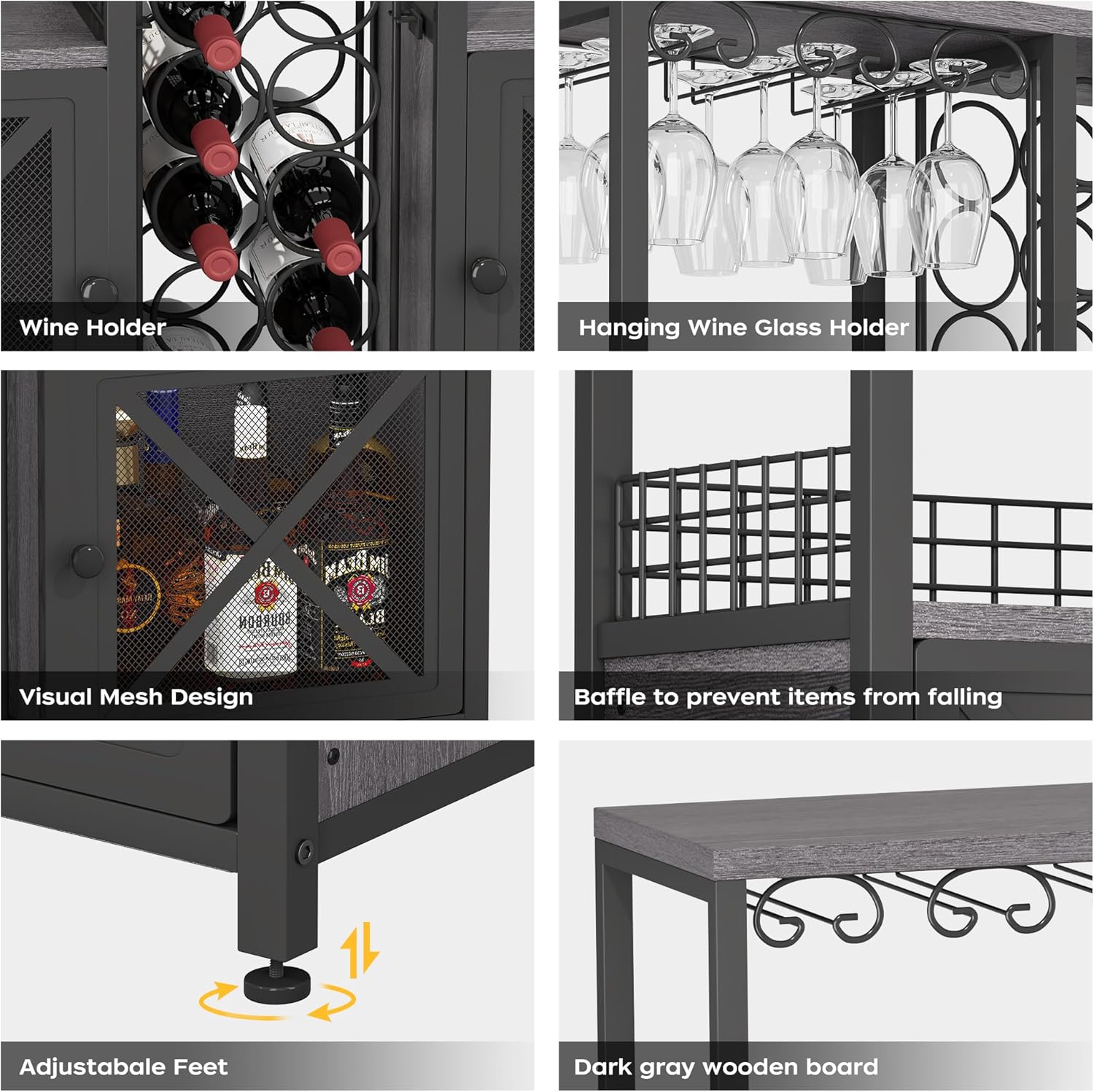 - [Multi-Directional Innovation]: Crafted with sturdy metal frame and durable wood panel, offering an excellent weight capacity of over 360lbs. Adjustable feet on the bottom to prevent wobbling even on uneven floors. The visual mesh door of wine bar makes it easier to access your items and has the benefit of ventilation. The mesh door of the wine cabinet is designed with magnetic suction, which can be easily and perfectly closed with a slight push.