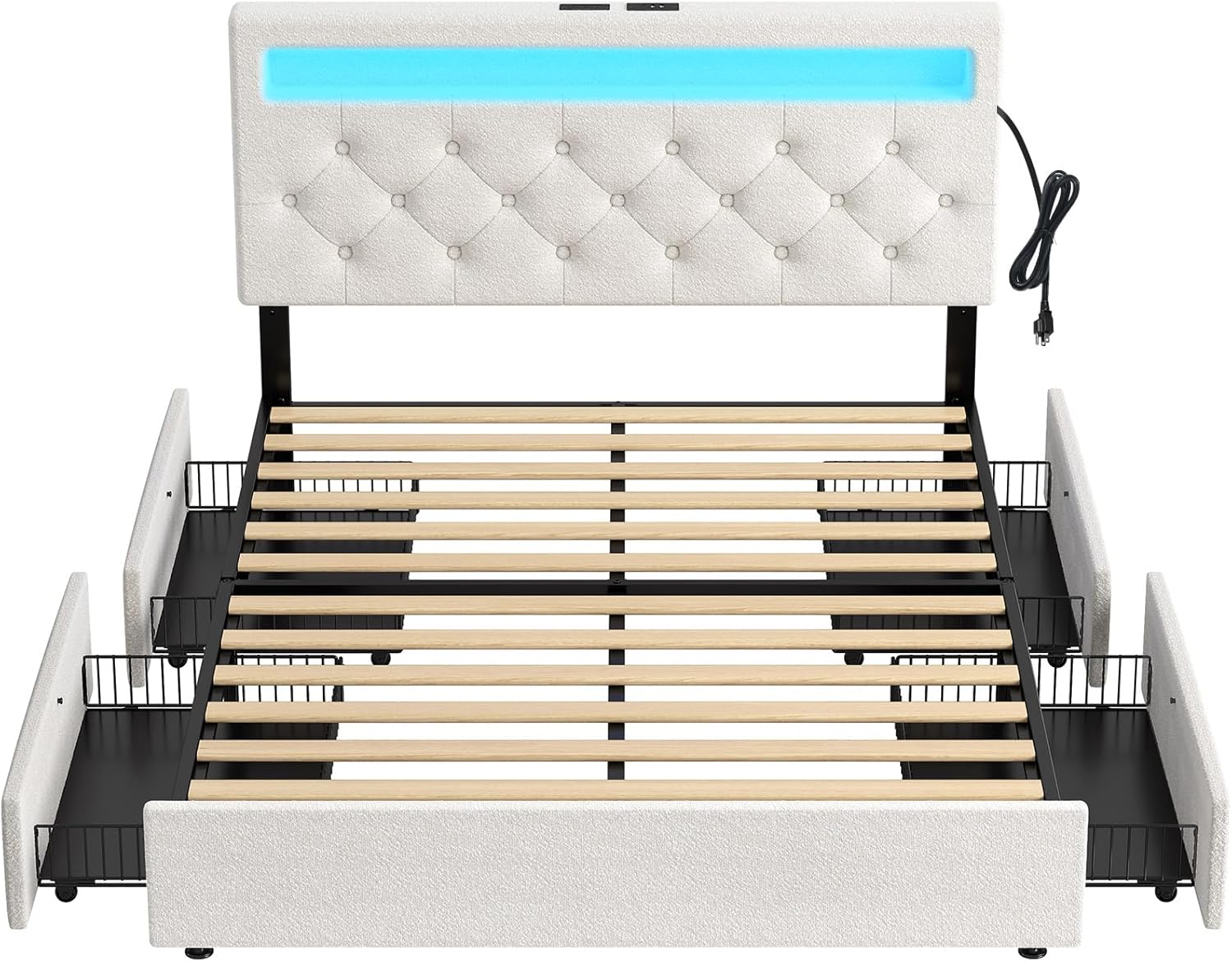 - 3 Charging Ports for More Devices: The full bed frame with storage comes with 2 USB + 1 Type-C ports, so you can conveniently charge multiple devices at once—perfect for keeping your phone, tablet, and LED lights powered while you relax in bed. The built-in charging station complements the 4 spacious storage drawers, keeping your bedroom organized and your devices fully charged