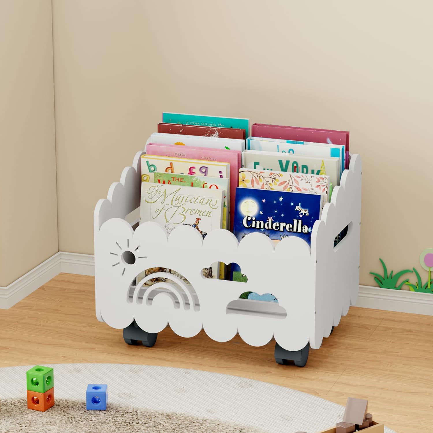 Wood Kids Bookshelf, Montessori Bookshelf, With 2 Adjustable Dividers, 4 Wheels Suitable Kids Rooms, Nursery & Classroom, Book Shelf For Kids Rooms, Toddler Book Rack, Nursery Book Shelves White
