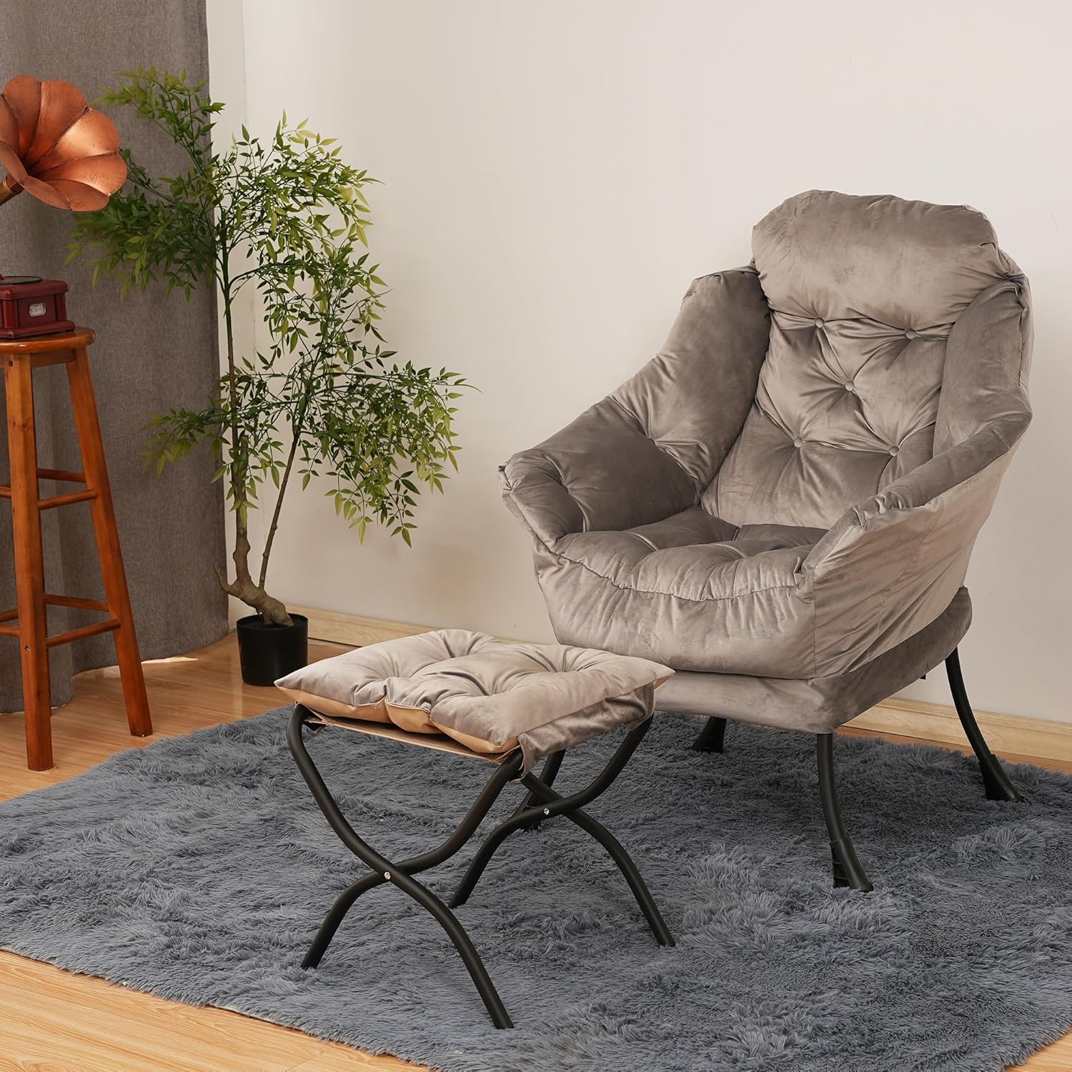 Lazy Chair with Folding Ottoman,Living Room Chairs, Accent Contemporary Lounge Chair, Single Steel Frame Leisure Sofa Chair with Armrests and A Side Pocket (Light Gray)