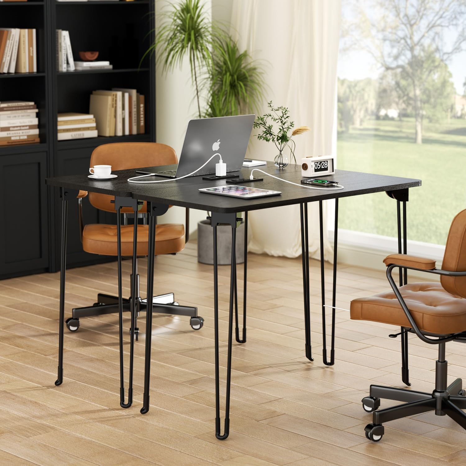 Folding Desk, 31.5" Hairpin Legs Small Desk with Power Strip for Bedroom, Space Saving Foldable Computer Desk for Home Office, No Assembly Need, Black