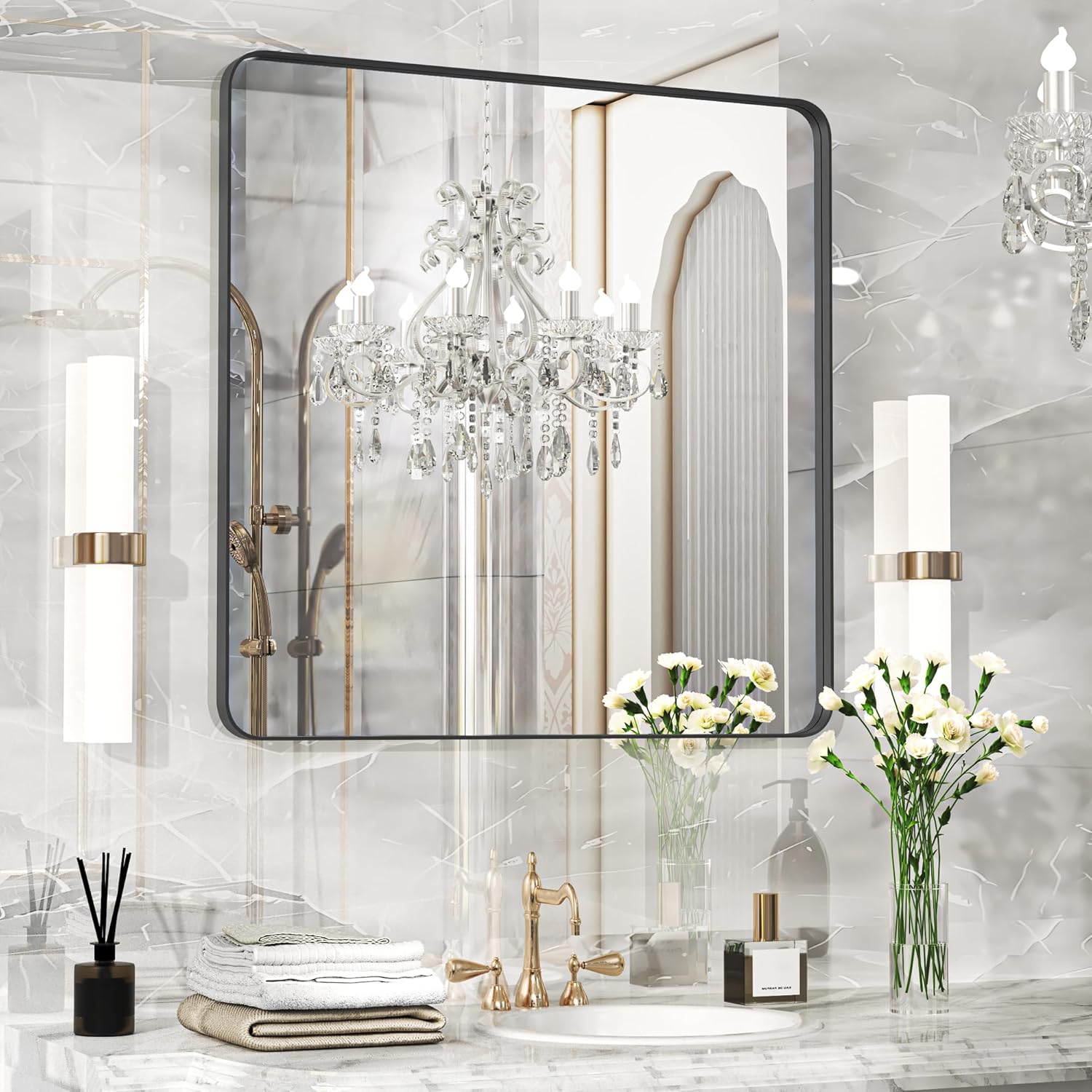 30×30 Black Bathroom Mirror, Rectangular Bathroom Vanity Mirror for Wall with Rounded Corners & Aluminum Alloy Frame, Tempered-Glass, Modern, Farmhouse, Horizontal/Vertical, Entryway, Bedroom