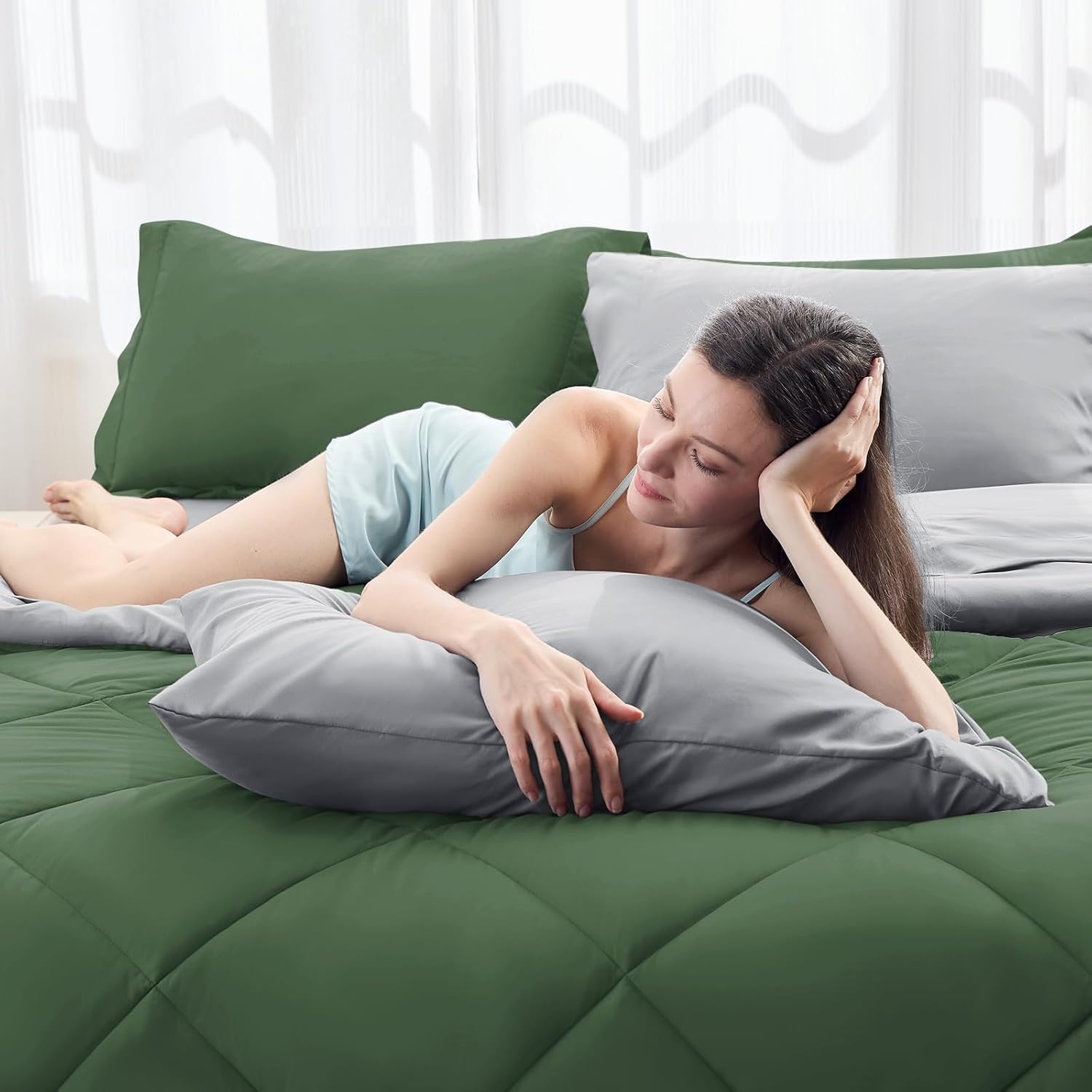 HEVUMYI King Comforter Set - 7-Piece All Season Bed in a Bag King, Ultra Soft Bedding Set with Comforter, Flat Sheet, Fitted Sheet, Pillowcases, Pillow Shams, Green & Light Grey