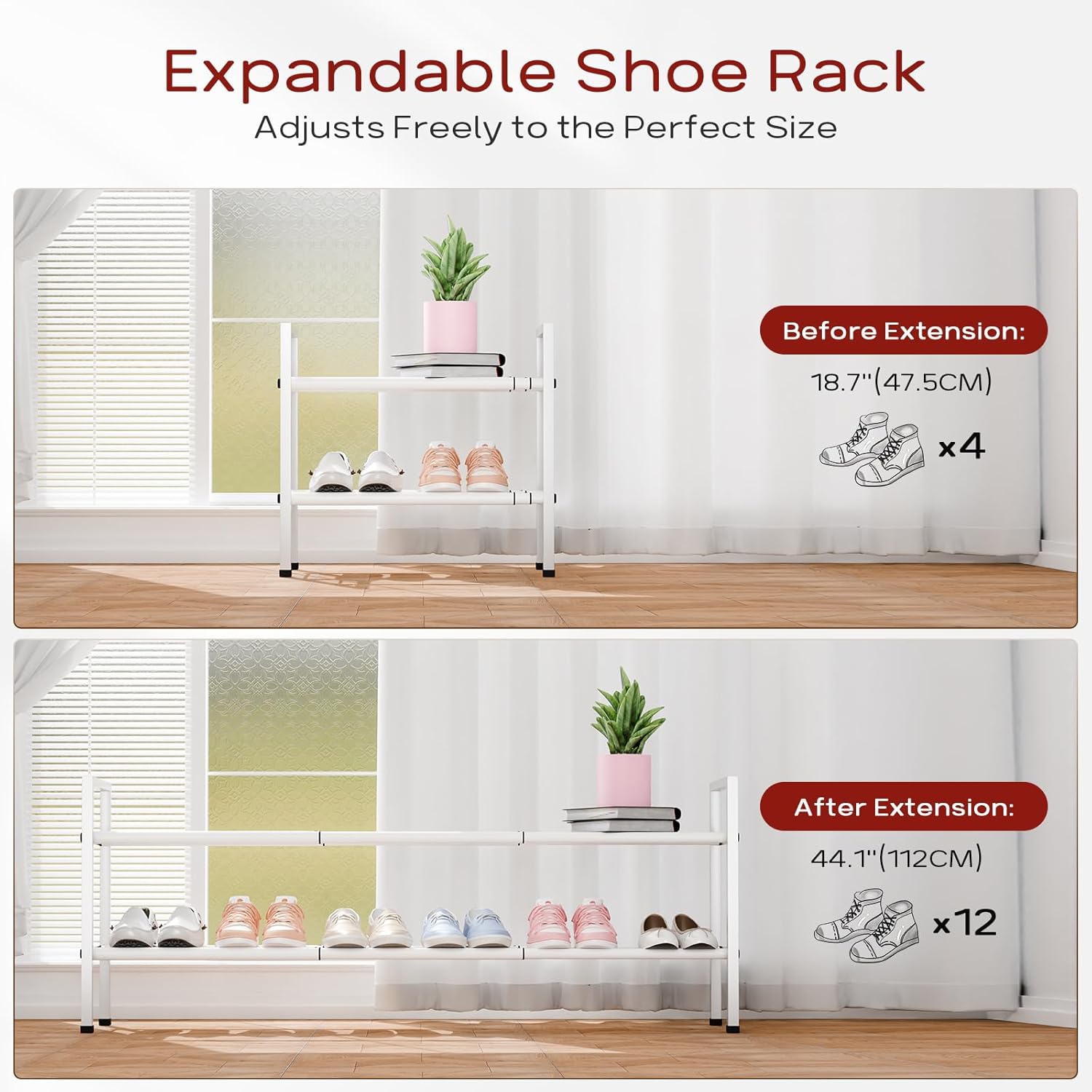 - ăExpandable Long Shoe RackăFeaturing a three-section telescopic design, this rack extends from 18 inches (45 cm) to 44 inches (112 cm), providing ample storage for up to 12 pairs of adult shoes.