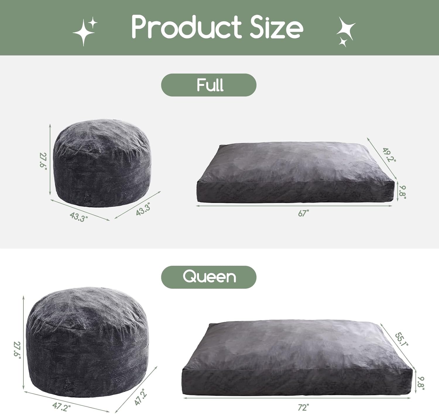 - Bean Bag Chair and Bean Bag Bed Convert Easily: The Bean Bag Bed was designed with the idea of utilizing the comfort and flexibility of a bean bag chair and expanding it into a larger, more comfortable sleeping space. Simply remove the chair cover and turn it into a bed. Tuck the bean bag bed into the chair cover to transform it back into a chair. The bean bag maintains a comfortable, flat shape, ensuring a good night's sleep without waking up with neck pain.