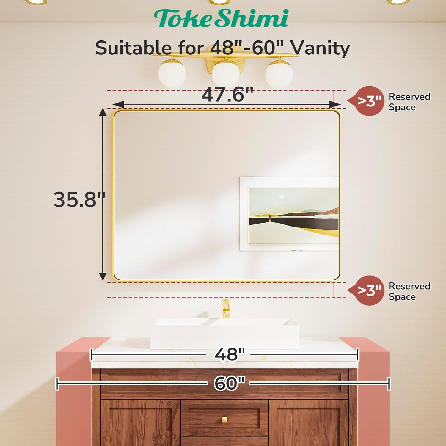 TokeShimi 48x36 Gold Bathroom Mirror for Over Sink,Tempered Glass,Rectangle Mirror for Bathroom,Large Bathroom Mirror for Vanity(Horizontal/Vertical)
