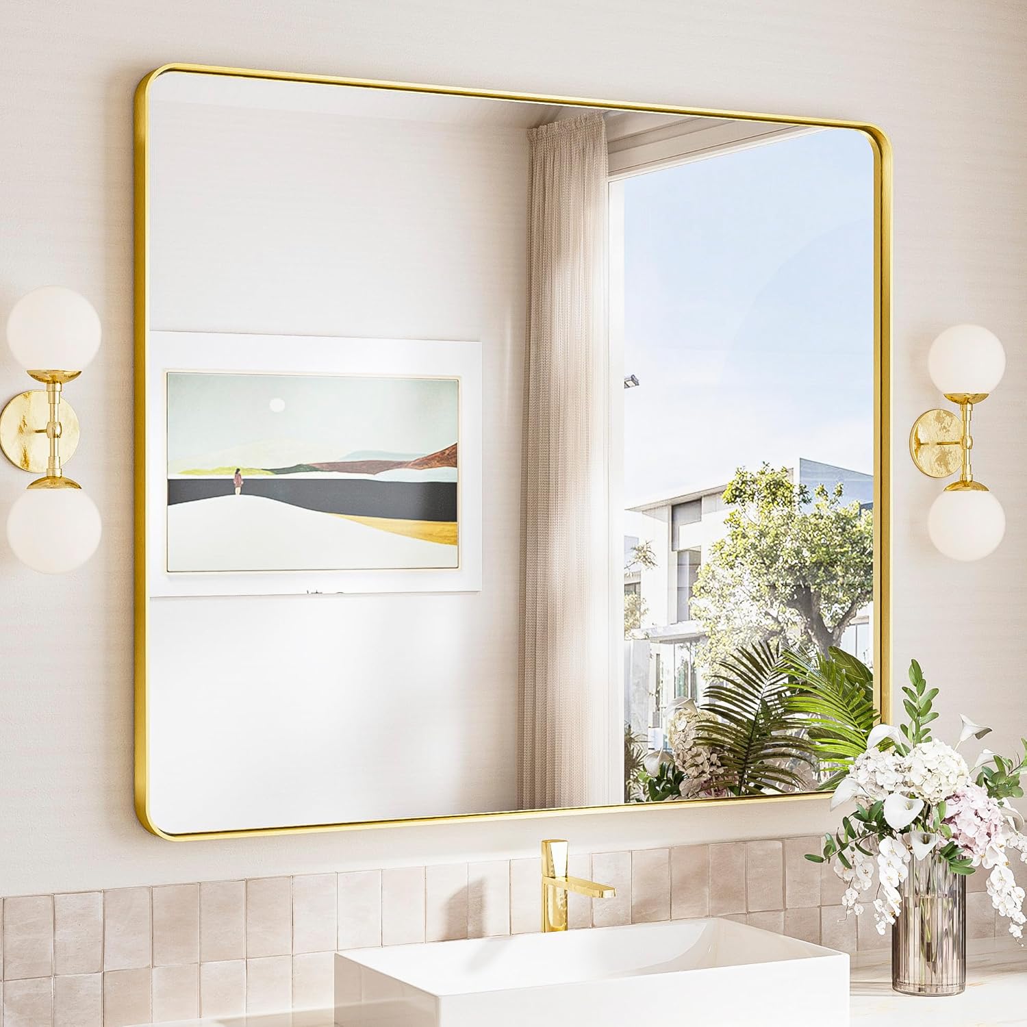 TokeShimi 42x36 Brushed Gold Bathroom Mirror for Over Sink,Bathroom Vanity Mirror with Tempered Glass, Modern Framed Wall Mirrors(Horizontal/Vertical)