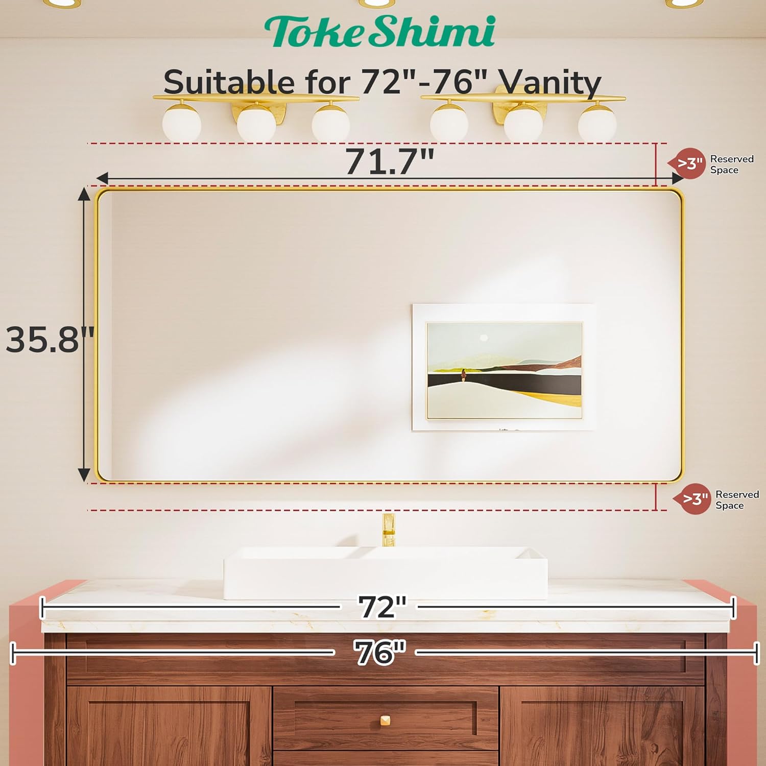 TokeShimi 72x36 Brushed Gold Bathroom Mirror,Tempered Glass,Bathroom Wall Mirror with Seamless Aluminum Frame,Modern Bathroom Vanity Mirror Shatterproof(Horizontal/Vertical)