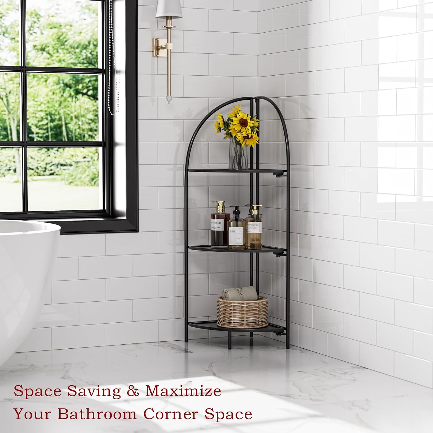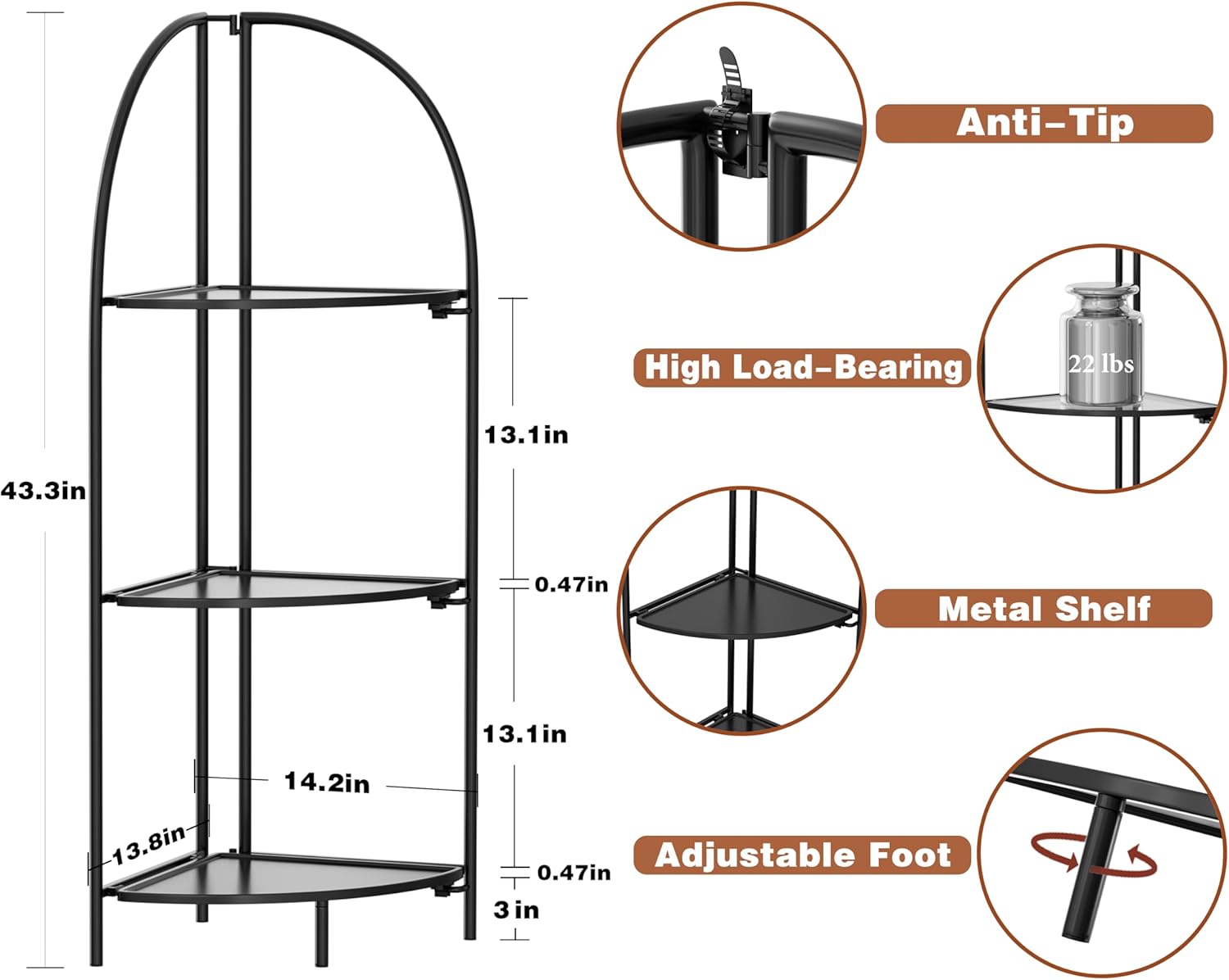 - 【Large Storage Capacity Corner Shelves】The height of the 3-tier corner shelf stand is 43.3 inches, the shelf radius is 12.8 inches, and the space between shelves is 13.1 inches, this tall shelf provides you with ample storage space to store Your books, photo frames, decorations, centerpieces, potted plants and other household items.