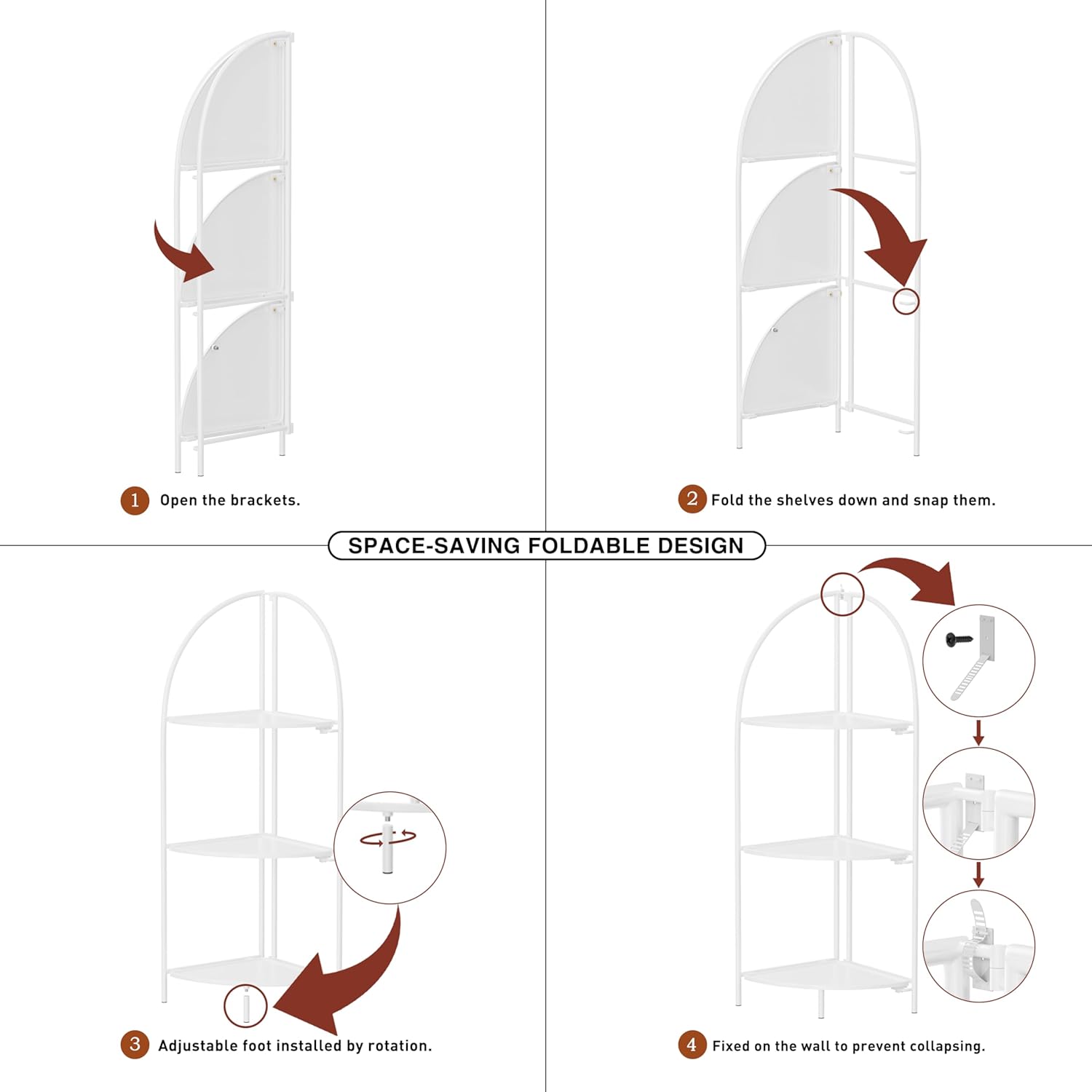 Crofy Foldable 3 Tier Corner Shelf, Metal Corner Plant Stand with White Frame and White Shelves, Corner Display Rack Multipurpose Shelving Unit for Living Room, Bedroom, Bathroom