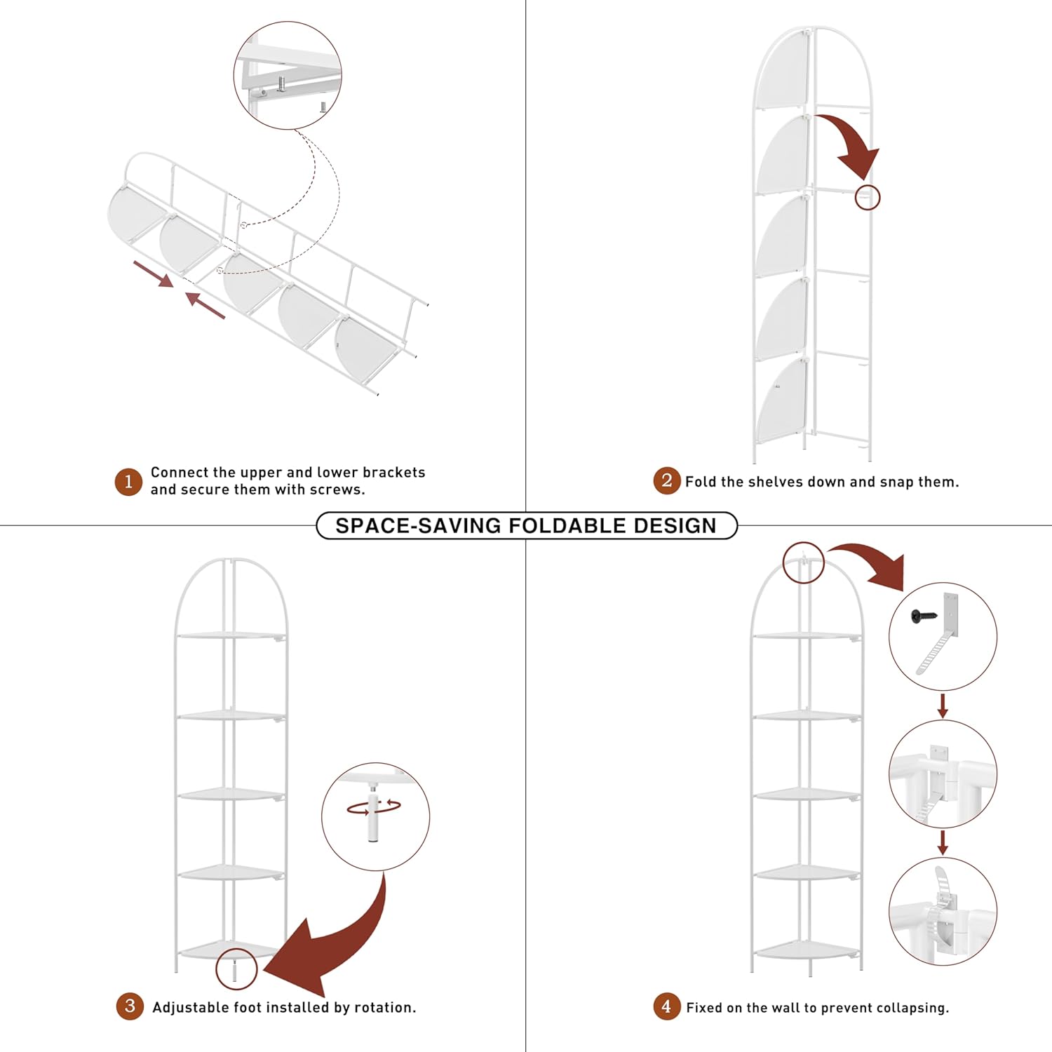 Crofy Foldable 5 Tier Corner Shelf, Metal Corner Plant Stand with White Frame and White Shelves, Corner Display Rack Multipurpose Shelving Unit for Living Room, Bedroom, Bathroom
