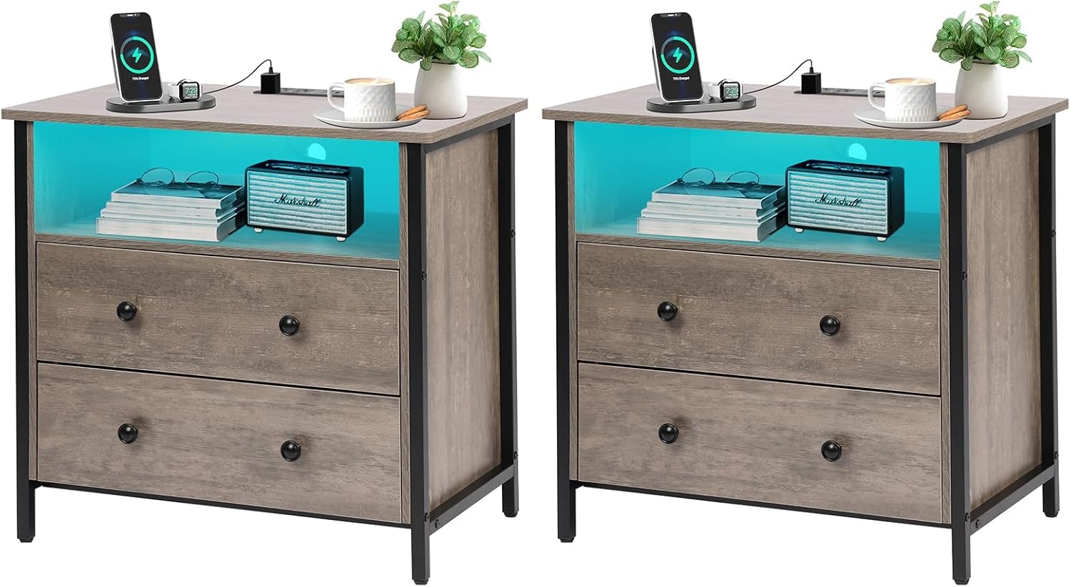 27 Inch Wide Night Stand, Lrage Wood Night Stand Set 2 with 2 Drawers, LED Nightstand with Charging Station and Adjustable Drawer, Bedside Table for Living Room/Bedroom/Study/Office, Gray.