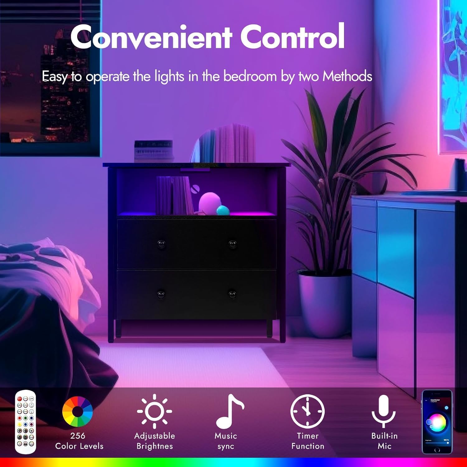 - 【Nightstand with LED lights】The night stand is equipped with a multifunctional RGB light strip with 28 dynamic modes, 12 static modes, 10 levels of brightness adjustment, 10 levels of speed adjustment, music synchronization, and timing functions. Multiple colors, brightness levels, and various flashing modes can be adjusted at any time via the remote control or APP. It adds a comfortable and fashionable dreamy feeling to your bedroom decoration, creating a warm and charming atmosphere