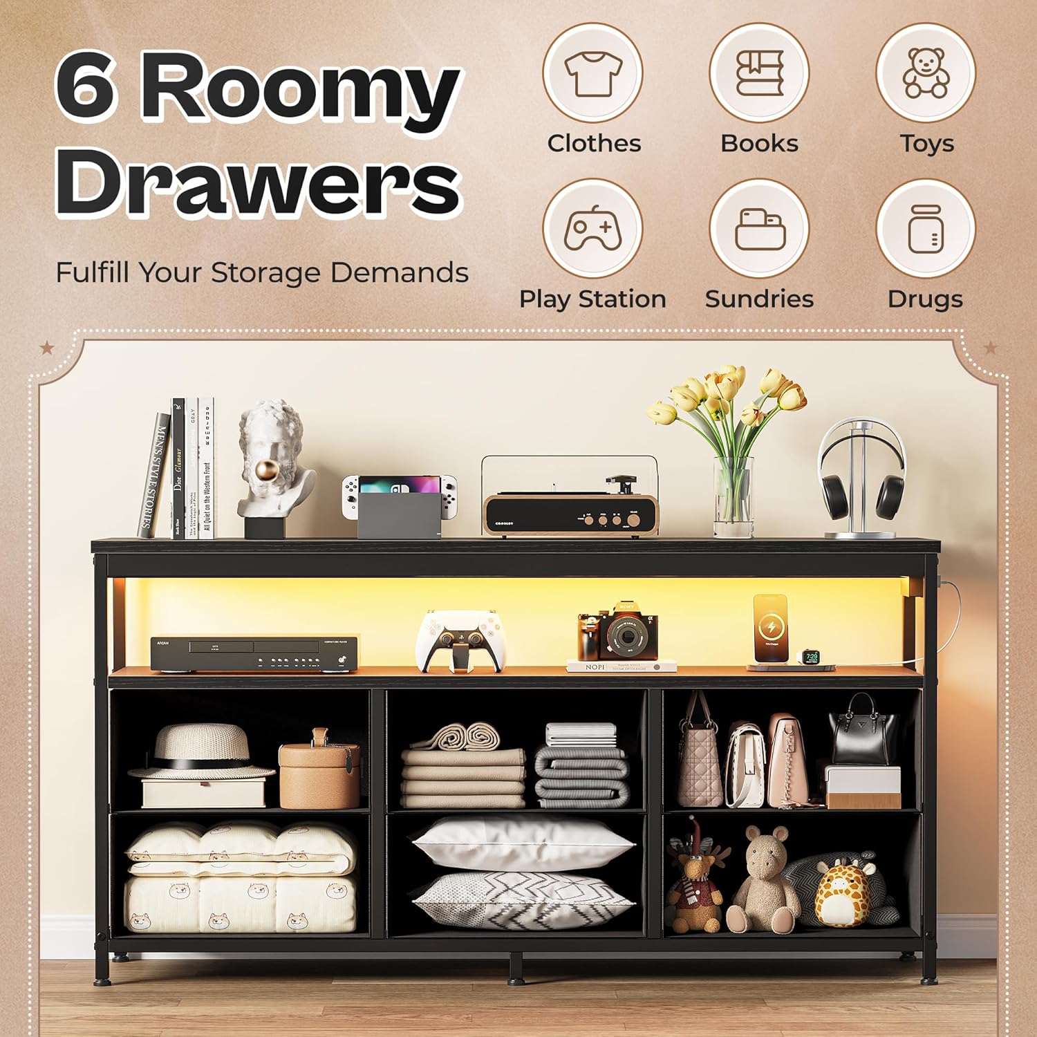 - 【Spacious 6-Drawer Storage & Support TV up to 55 Inches】With 6 large fabric drawers, this 6 drawer dresser for bedroom is perfect for storing essentials, from clothes and blankets to books and electronics. The open shelf is ideal for showcasing photos, plants, or decorative items, and and spacious desktop can securely support a TV up to 55 inches, creating a tidy, multifunctional space in your home