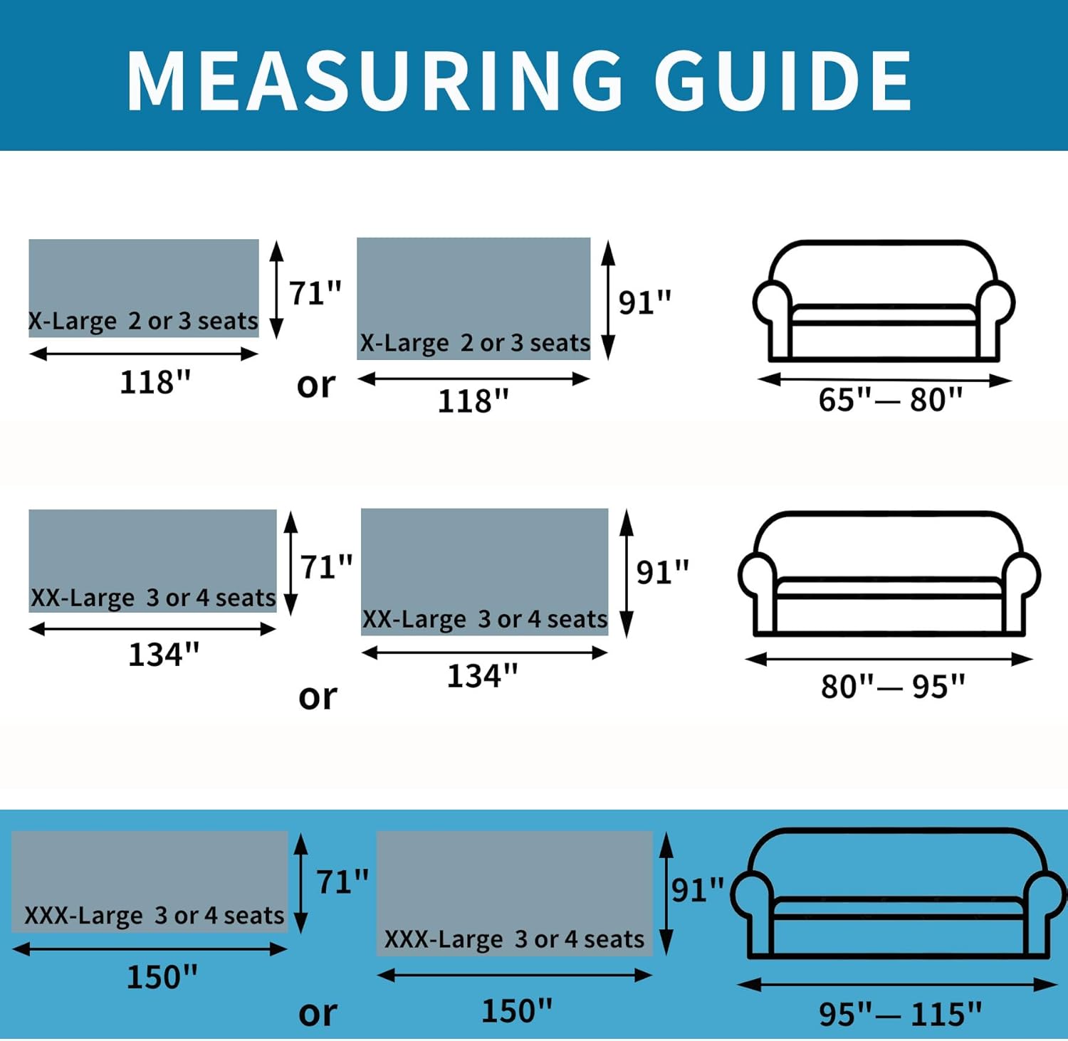 - SIZE CHOICE: Before choosing sofa covers washable, please measure the size of your sofa. Size 71 "x 118" or 91 "x 118" is suitable for double or small 3-seater sofas, size 71 "x 134" or 91 "x 134" is suitable for 3-seater sofas or small 4-seater sofas, size 71 "x 150" or 91 "x 150" is suitable for couch blanket cover of oversized sofas, and for couch covers for sectional sofa, two sofa slipcovers need to be selected. For detailed information, please refer to the measurement guide in Figure 4.