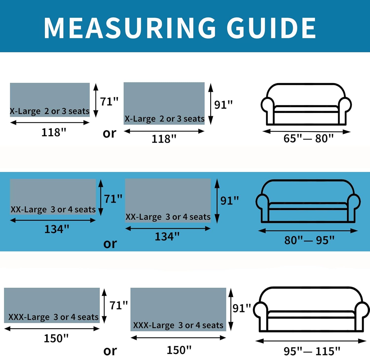 - SIZE CHOICE: Before choosing sofa covers washable, please measure the size of your sofa. Size 71 "x 118" or 91 "x 118" is suitable for double or small 3-seater sofas, size 71 "x 134" or 91 "x 134" is suitable for 3-seater sofas or small 4-seater sofas, size 71 "x 150" or 91 "x 150" is suitable for couch blanket cover of oversized sofas, and for couch covers for sectional sofa, two sofa slipcovers need to be selected. For detailed information, please refer to the measurement guide in Figure 4.