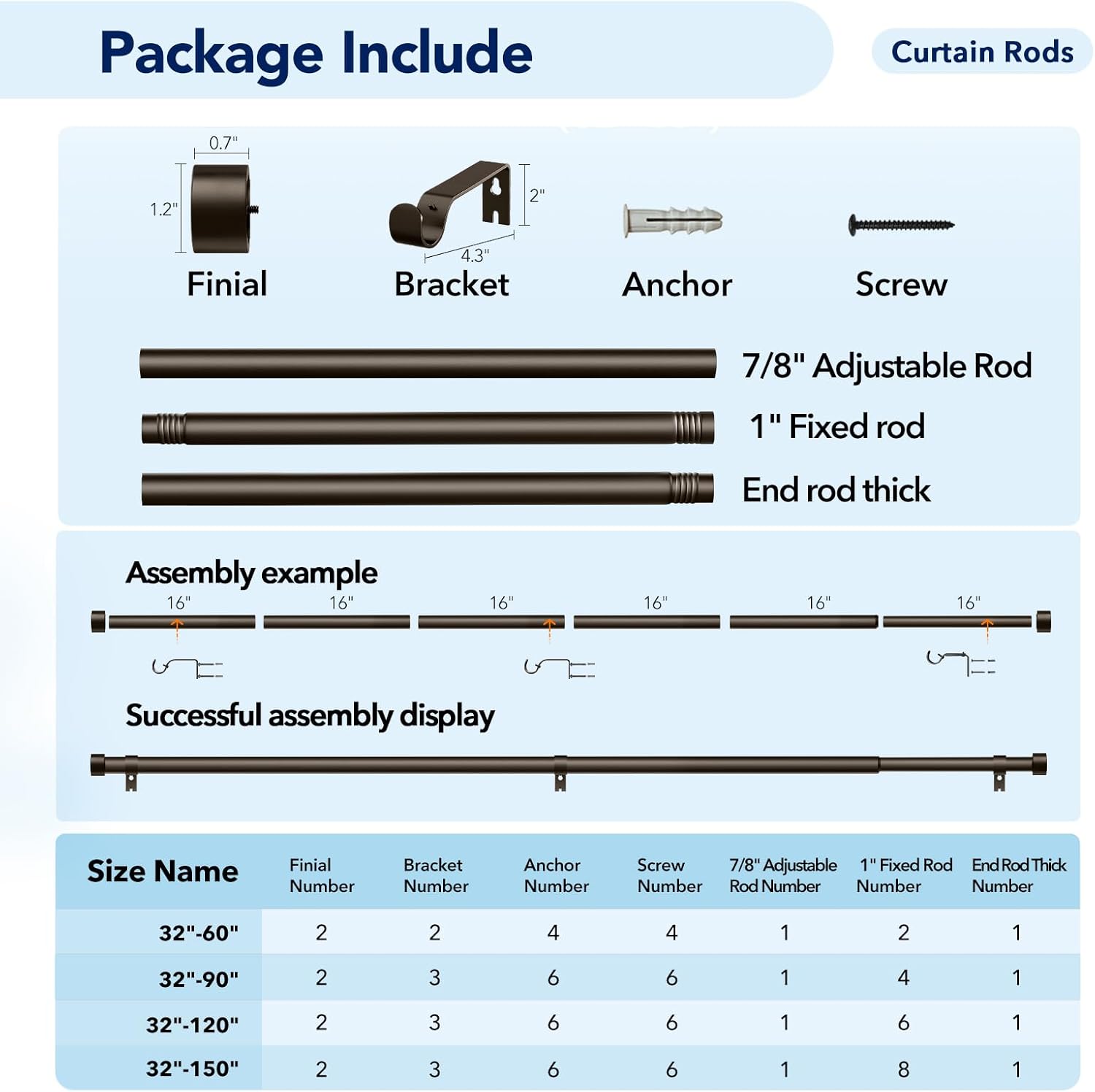 - Easy to Install: Adjustable curtain rod structure is designed to avoid troubles caused by small measurement errors. The heavy duty curtain rods can be easily assembled in a few simple steps. The curtain rods comes with all the hardware needed for easy installation, including brackets, screws, drywall anchors and installation instructions.