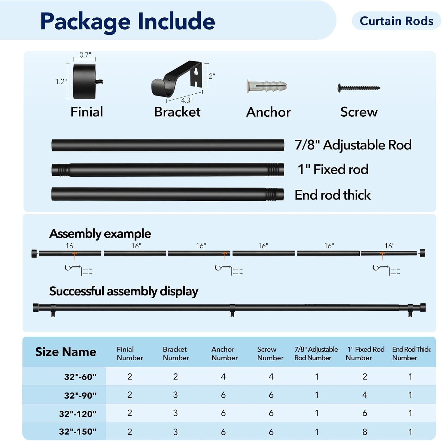 - Easy to Install: Adjustable curtain rod structure is designed to avoid troubles caused by small measurement errors. The heavy duty curtain rods can be easily assembled in a few simple steps. The curtain rods comes with all the hardware needed for easy installation, including brackets, screws, drywall anchors and installation instructions.