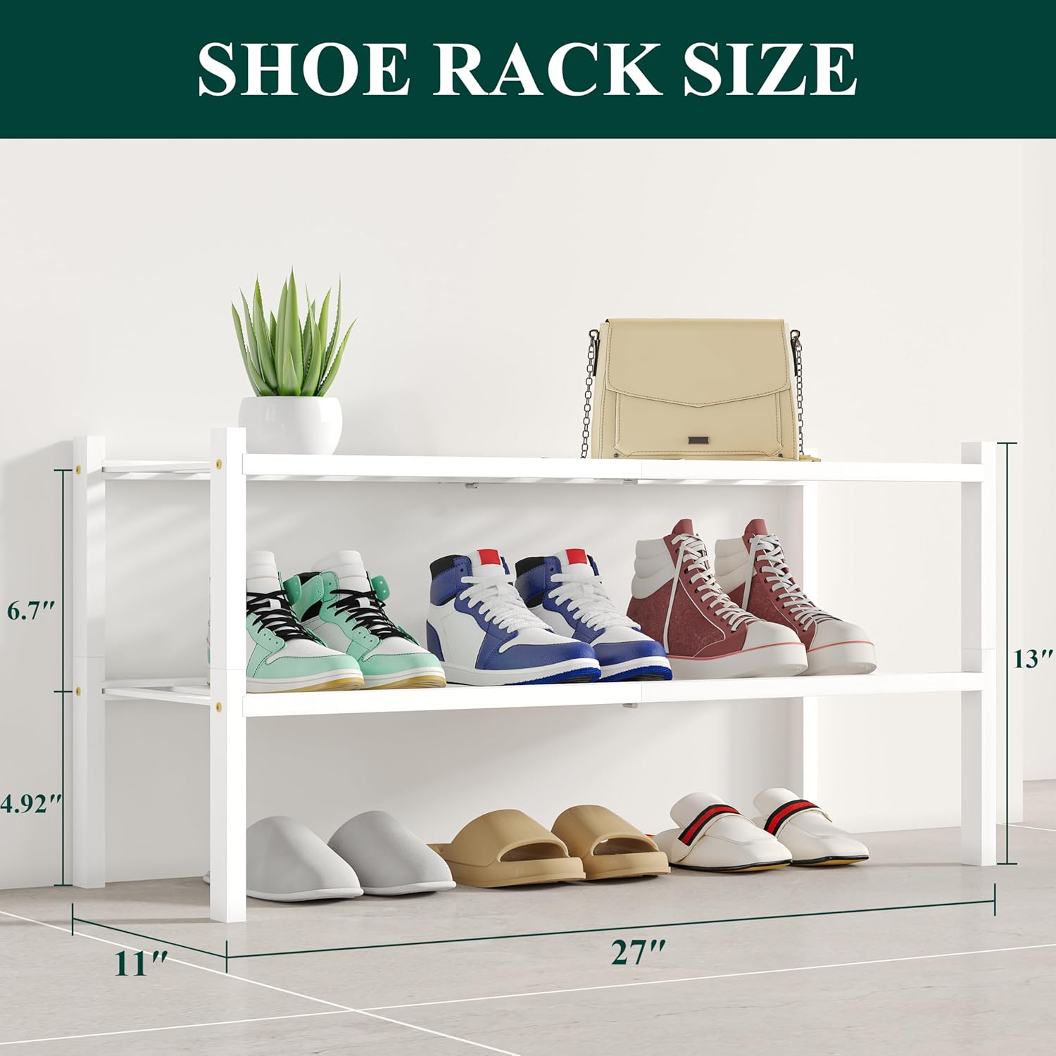 Smiry Shoe Rack, 2 Tier Bamboo Shoe Organizer, Stackable Free Standing Wooden Shoe Storage Shelf for Closet, Entryway, Front Door Entrance, White