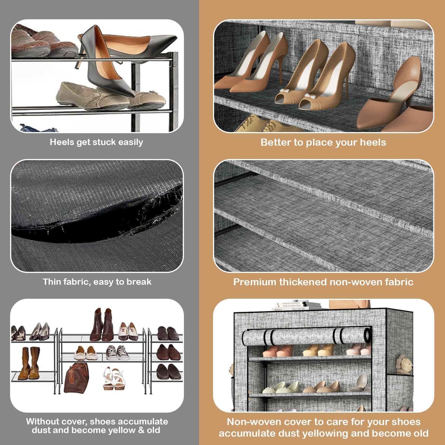 - 【UPGRADED THICKENED PREMIUM QUALITY DUST COVER, MORE EFFECTIVE WATER AND DUST RESISTANCE】- High quality thickened non-woven dust cover, compared to the ordinary model dust cover which is only less than 60 grams, our thickened high quality dust cover is 100 grams, doubled on the basis of the ordinary model, which makes your free standing shoe racks more textured, thus meeting your needs for a high-quality tall shoe shelf, at the same time, protects your shoes from dust, glare and dirt, and takes better care of your shoes to ensure that the Shoe Cleanliness.