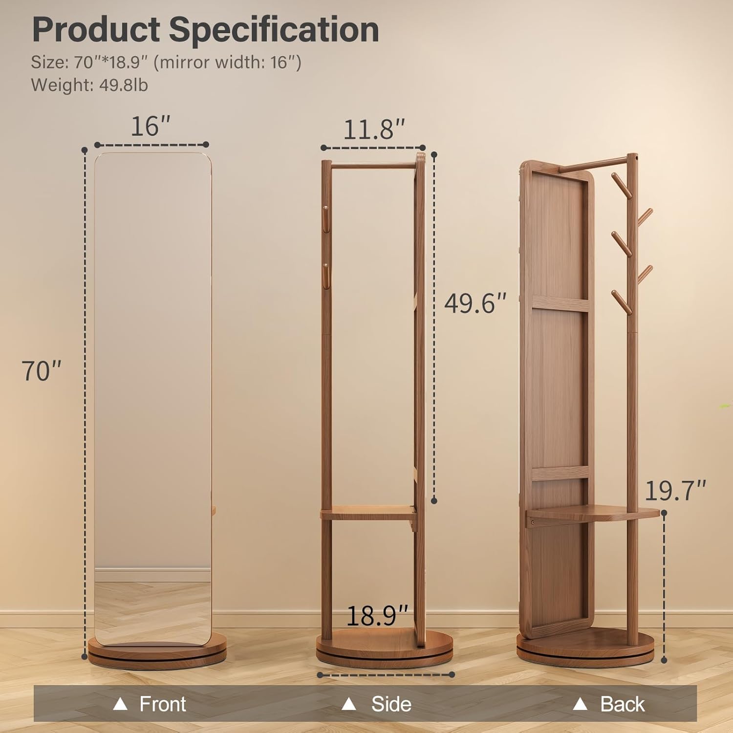 70"x16"Full Length Mirror with Stand,Coat Rack with Mirror,Solid Wood Floor Mirror,Swivel Mirrorfor Bedroom, Living Room, Cloakroom