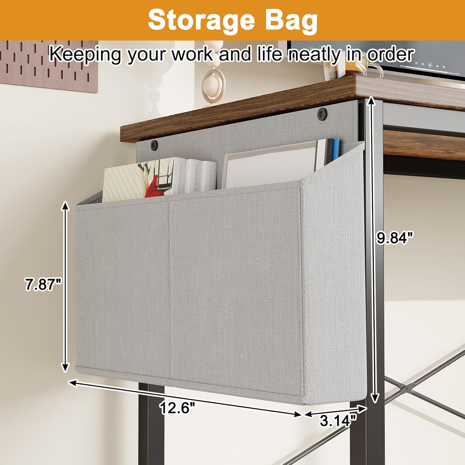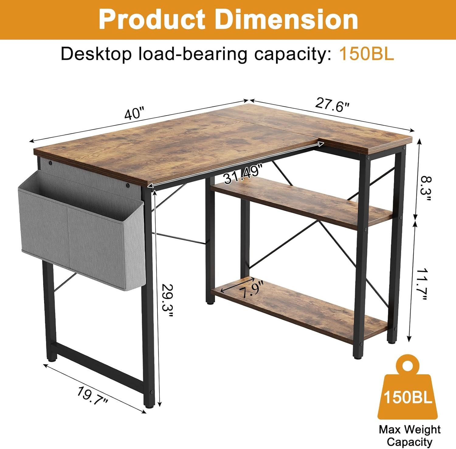 - L-shaped desk with shelves and storage bag keeps your workspace organized.