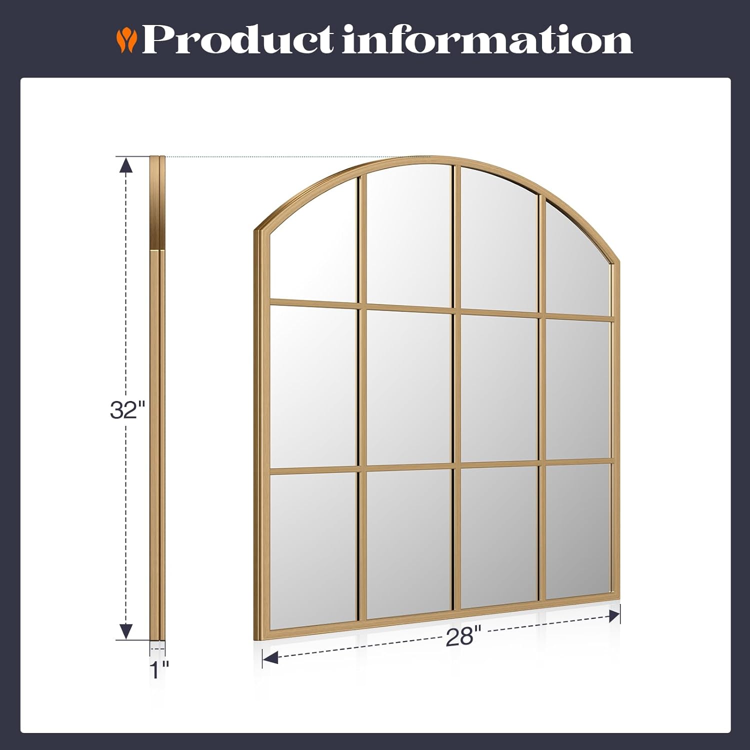 Wide Window Pane Mirror, 28" x 32" Gold Arched Mirrors for Wall, Brass Grid Wall Large Decorative Mirror for Living Room Bedroom Farmhouse Fireplace Hallway Entryway