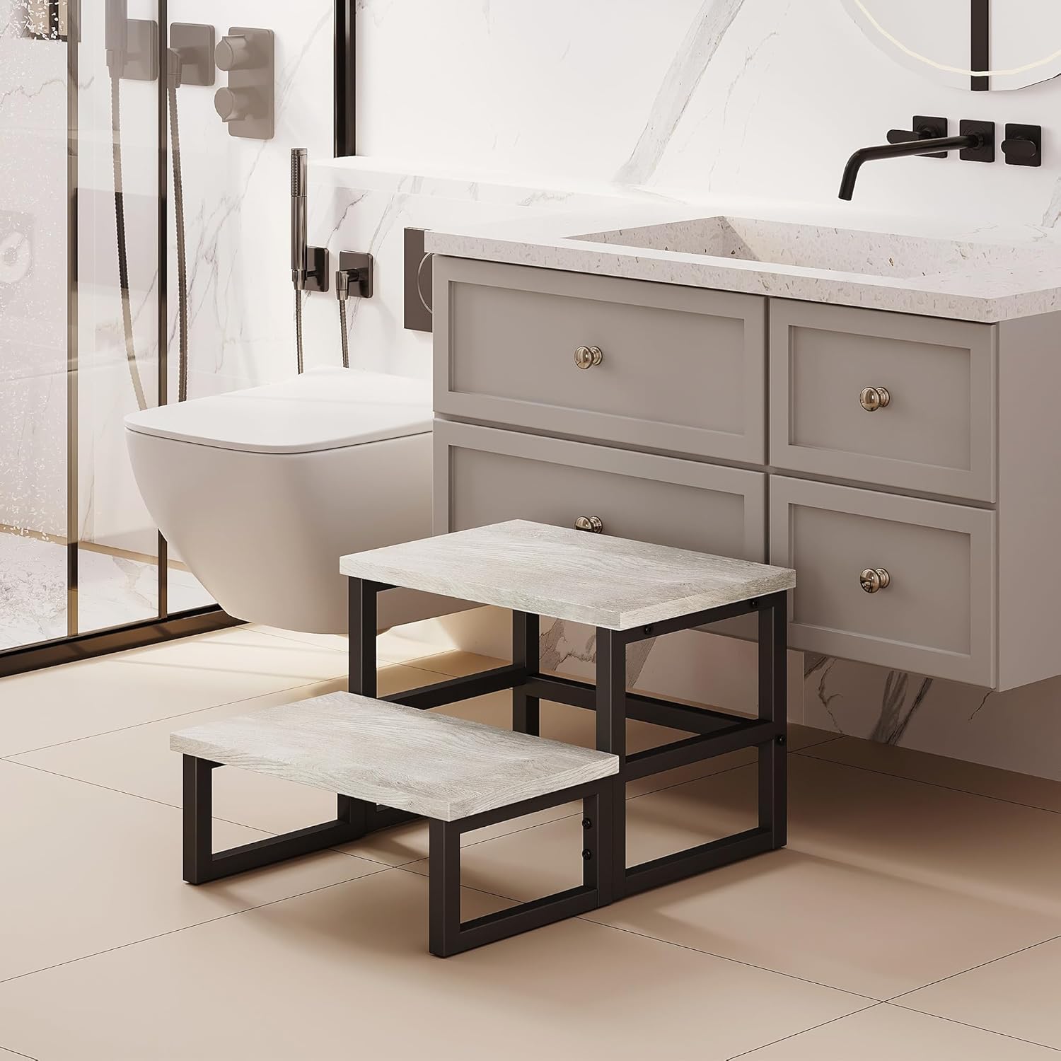 - Multi-Purpose 2 Tier Step Stool 】It can be used for kids tollder, helps children reach the bathroom sink, kitchen counter, high beds, bathtub or bookshelf, they can wash hands and brush teeth at bathroom sink, toilet potty training, also it could be used for adults, It is useful at the bedside and for reaching items in high cabinets in the kitchen or living room.